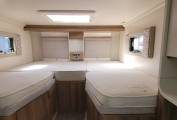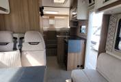The main features are a spacious layout, including a rear fixed bed that converts into a large double bed, front dinette with additional seating, and a well-equipped kitchen with oven, grill, microwave, hob and fridge. The bathroom includes shower cubicle and cassette toilet, offering home-like convenience on the road.