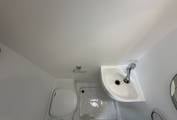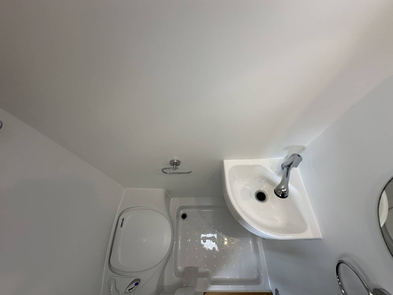 Opposite there is a floor to ceiling storage cupboard, a 12v fridge with a freezer box below a wardrobe, and the wet room which has a toilet, a hand basin, and a shower.