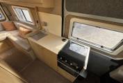 In the centre of the camper, beside the side door, is the nearside kitchen which has a hob with 3 gas burners, a combination gas oven/grill, and a sink.
