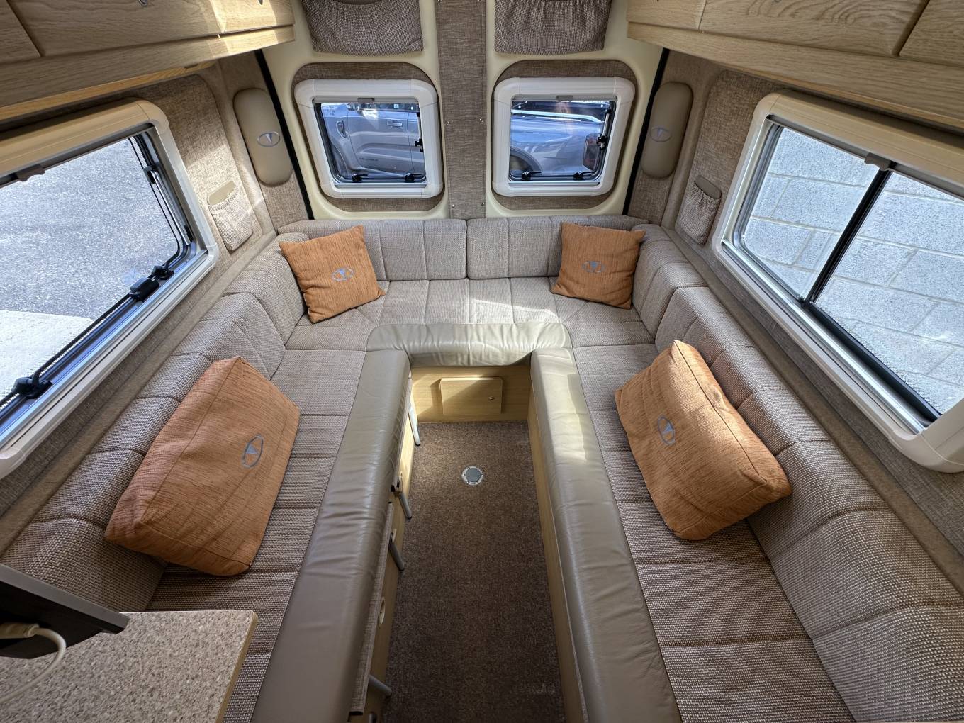 By rotating the swivel cab seats, a snug, fast dining spot can be created up front, which also provides a leisure space if the rear area is hosting a lie in or an early night. The vehicle is supplied with two table top sizes and two removeable leg lengths (together with a tripod foot for external use). The real star of this layout, the airy and spacious U-shaped rear lounge can be readily converted into a transverse double bed (190cm (L) x 184cm (W)), or used as two single beds (each 190cm (L) x 65cm (W)).