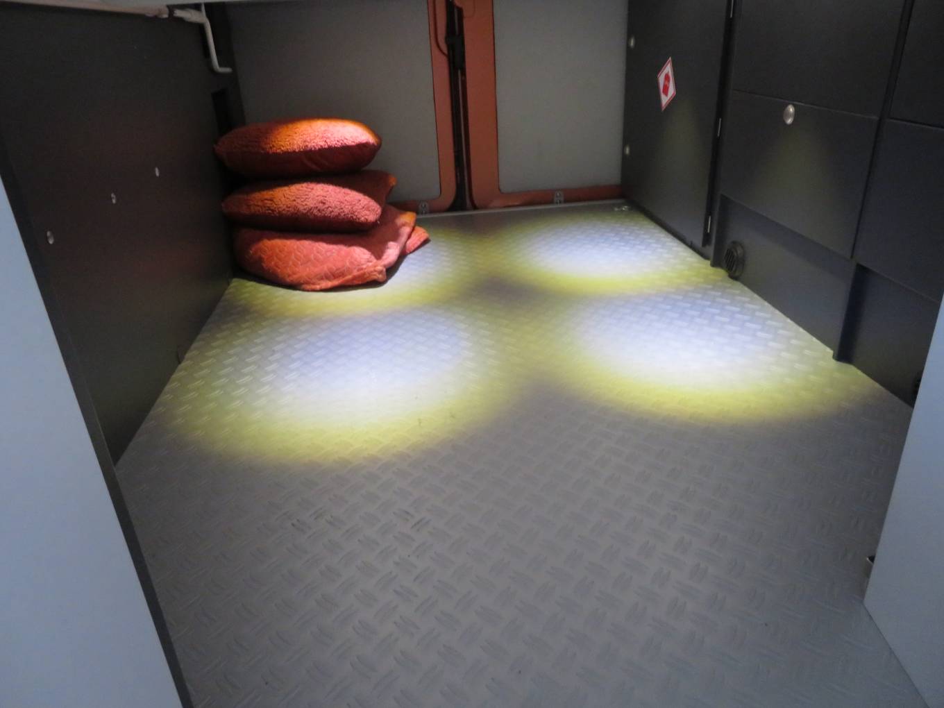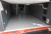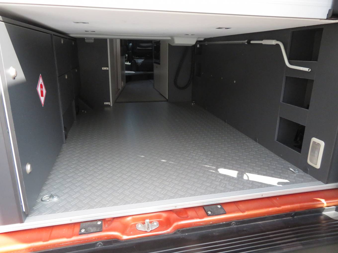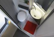 As you step inside you immediately notice that the inside is as well presented as the exterior of this motorhome. At the front of the motorhome there are two captains chairs and two extra belted seats allowing for 4 travelling seats and a seating area around the table for 4. At the rear of the motorhome is a Electric Drop Down Double Bed . The bed is over a large storage garage that can be accessed from the inside or through the rear doors. You then come to a very nice, well equipped kitchen, fitted out with an oven, 2 burner gas hob, sink and a large fridge with ice box. There are plenty of storage cupboards and compartments throughout the living and kitchen areas giving you excellent storage in a compact motorhome. Across from the kitchen is a lovely bathroom equipped with sink, toilet and a shower. The shower cubicle is designed so as to not require a curtain.