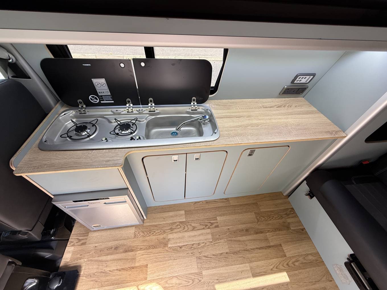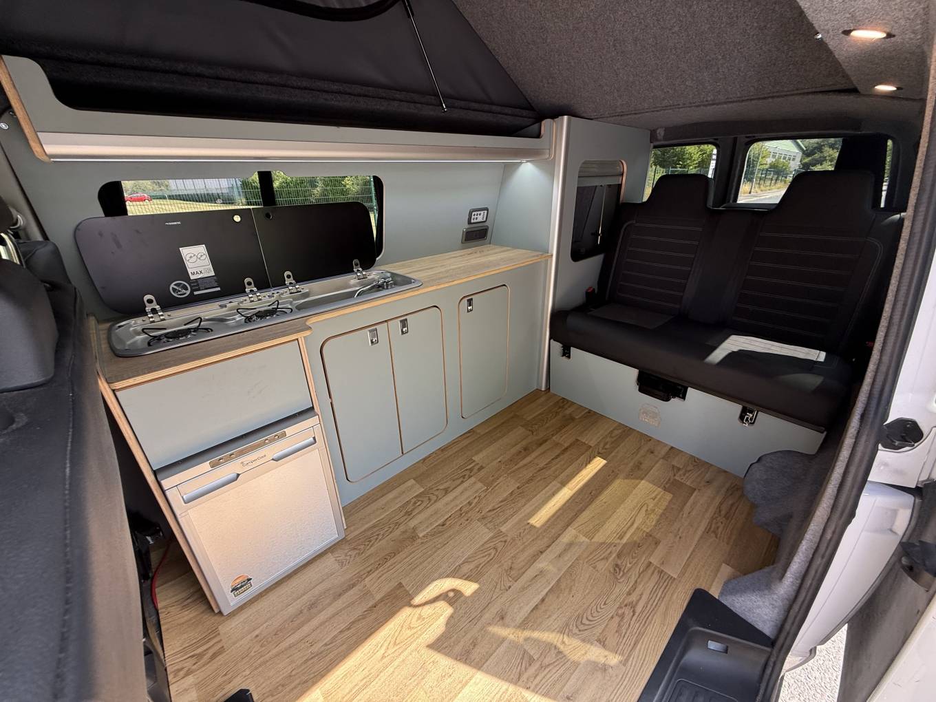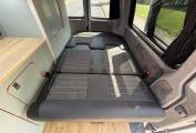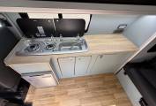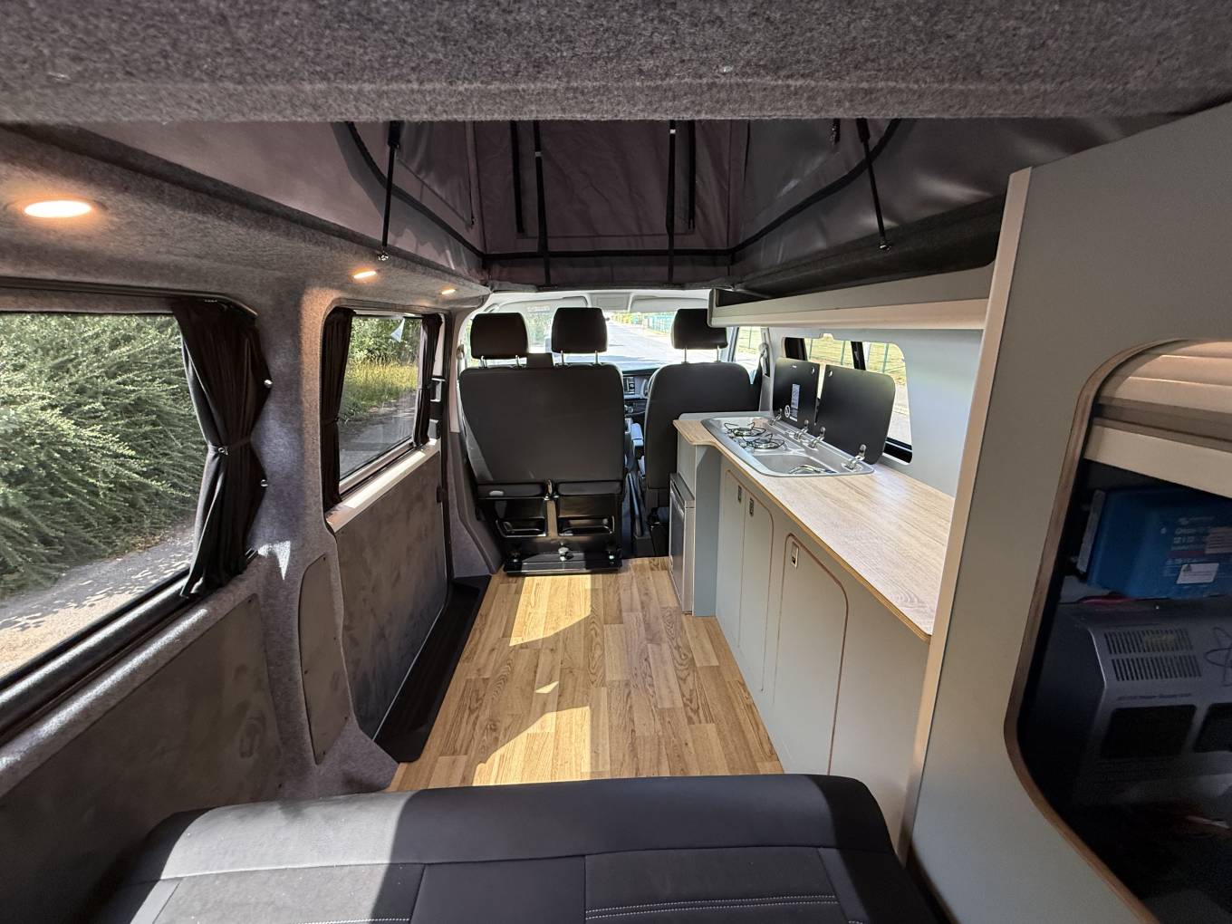 Entering through the side door we are greeted by the attractive interior with stylish duck egg blue units complimented by wood effect worktops and flooring. There is an abundance of storage along with a Dometic combination sink/hob and CamperCool Fridge. The rock and roll bed features two additional 3 point seatbelts and also creates a comfortable double bed. For Dining the front double passenger seat can swivel to allow four to sit around the large removable table. You will find the second sleeping area in the pop top which has a panoramic canvas giving plenty of natural light. When this is not being used it pushes up to maximise head room.