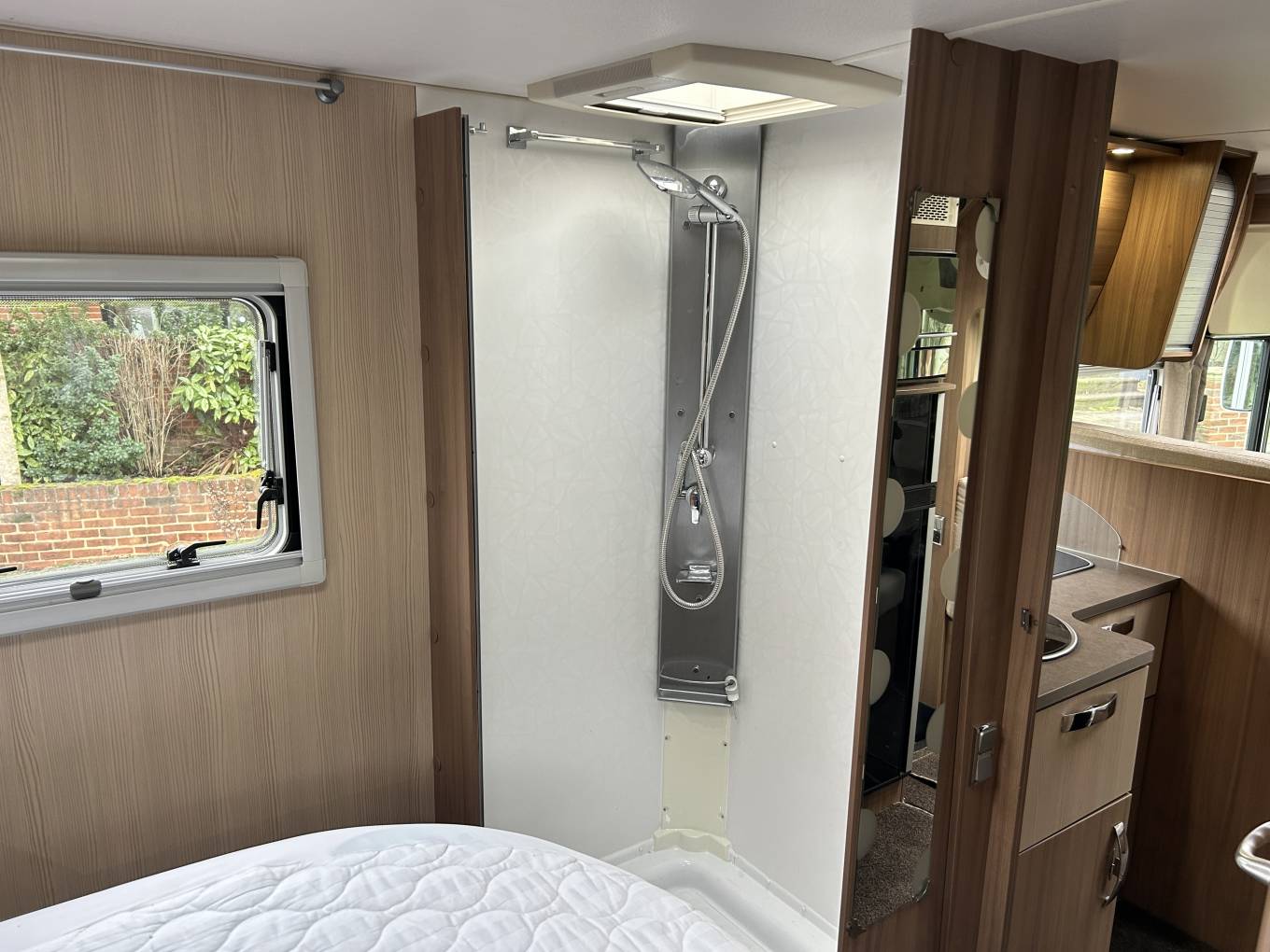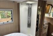 The well-appointed kitchen is equipped for life on the road, featuring a three-burner gas hob, oven and grill, extractor fan, and a new Dometic fridge freezer fitted in 2023 with automatic energy selection — offering convenience whether you’re on electric hook-up or off-grid. Opposite, the cleverly designed split washroom provides a large separate shower with screen doors on one side and a toilet, wash basin, mirror and storage cabinet on the other, creating a true en-suite feel rarely found in motorhomes of this class.