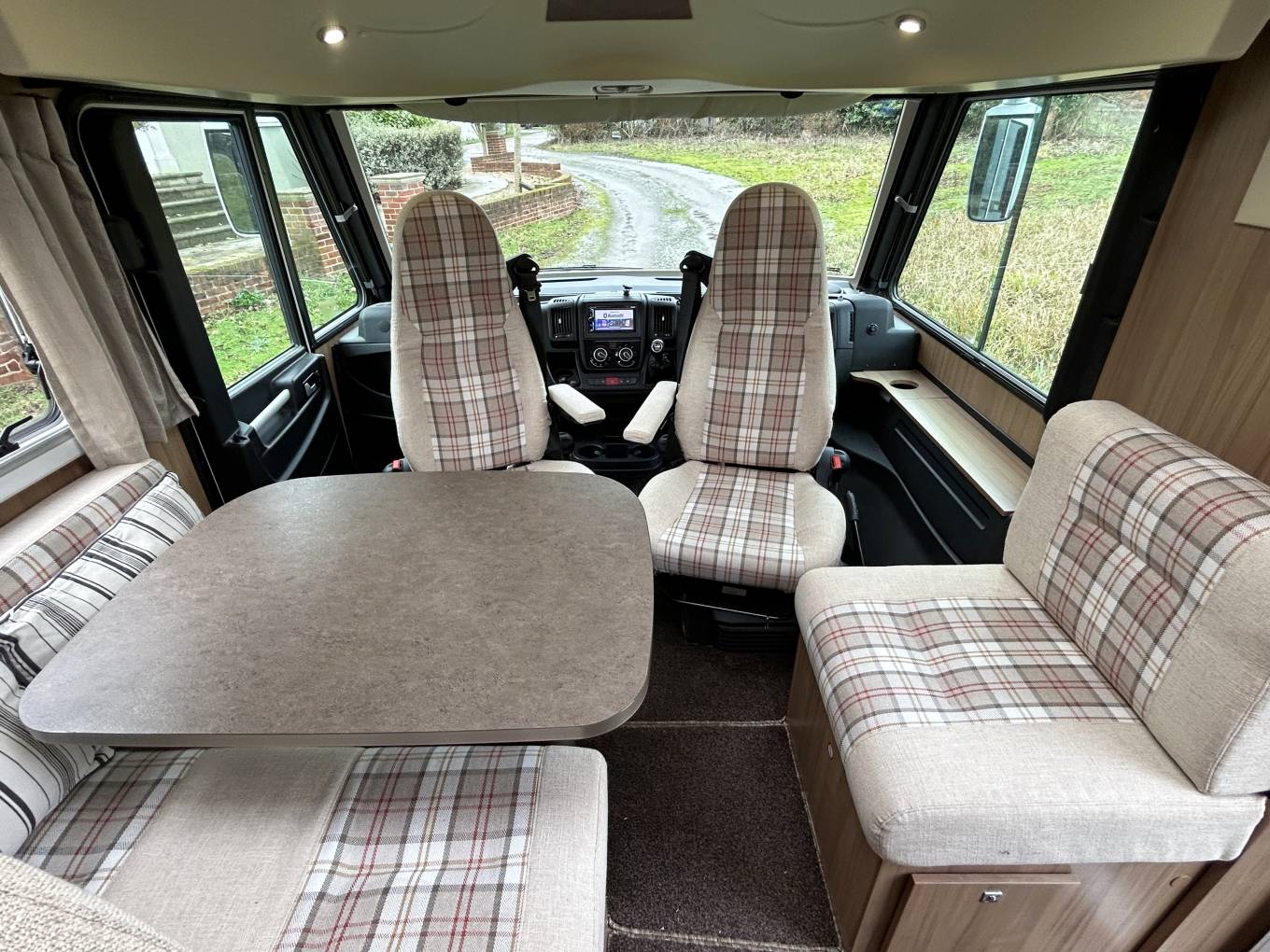 The front lounge area is bright and inviting, enhanced by two swivel cab seats that create a sociable, open-plan living space ideal for relaxing or entertaining. Recently reupholstered, the interior feels fresh, modern and ready for its next owners.