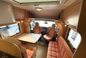 The dinette area has a removable table with extension. The cab seats are captain’s chairs and rotate to provide seating for up to 6 people. Multiple USB/12V points for charging devices. Above the table is a cupboard with a sliding door and connections for a TV.