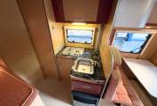 The kitchen has a 3-burner hob, Stainless steel sink unit with Mixer tap, combination gas oven/grill with microwave above. 2 mains sockets. 3 way fridge freezer runs from the engine, mains electric or gas. Hot water & heating is provided by a newly fitted Truma boiler running off gas or mains electric with an additional heater in the passenger area heated from the engine for extra warmth when travelling . There are several cupboards,