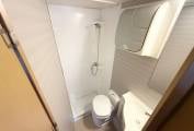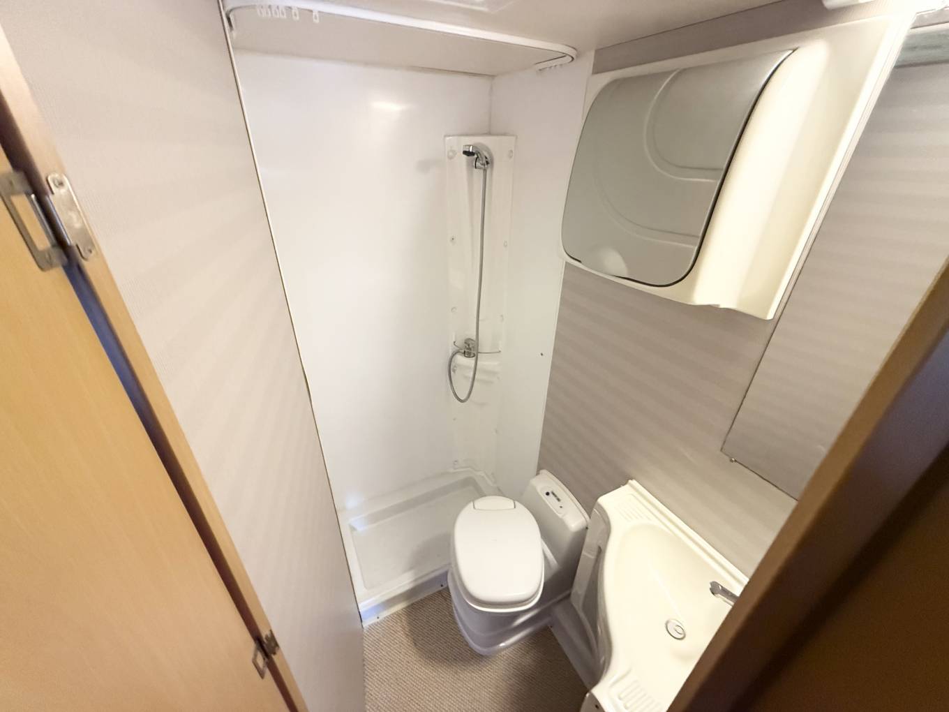 The bathroom has a vanity unit with a new ceramic washbasin, good storage underneath, a large separate shower, and a Thetford cassette toilet with electric flush.