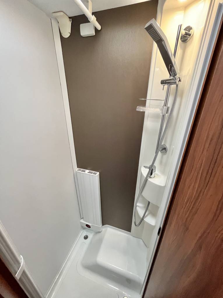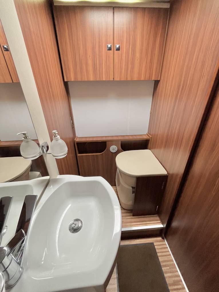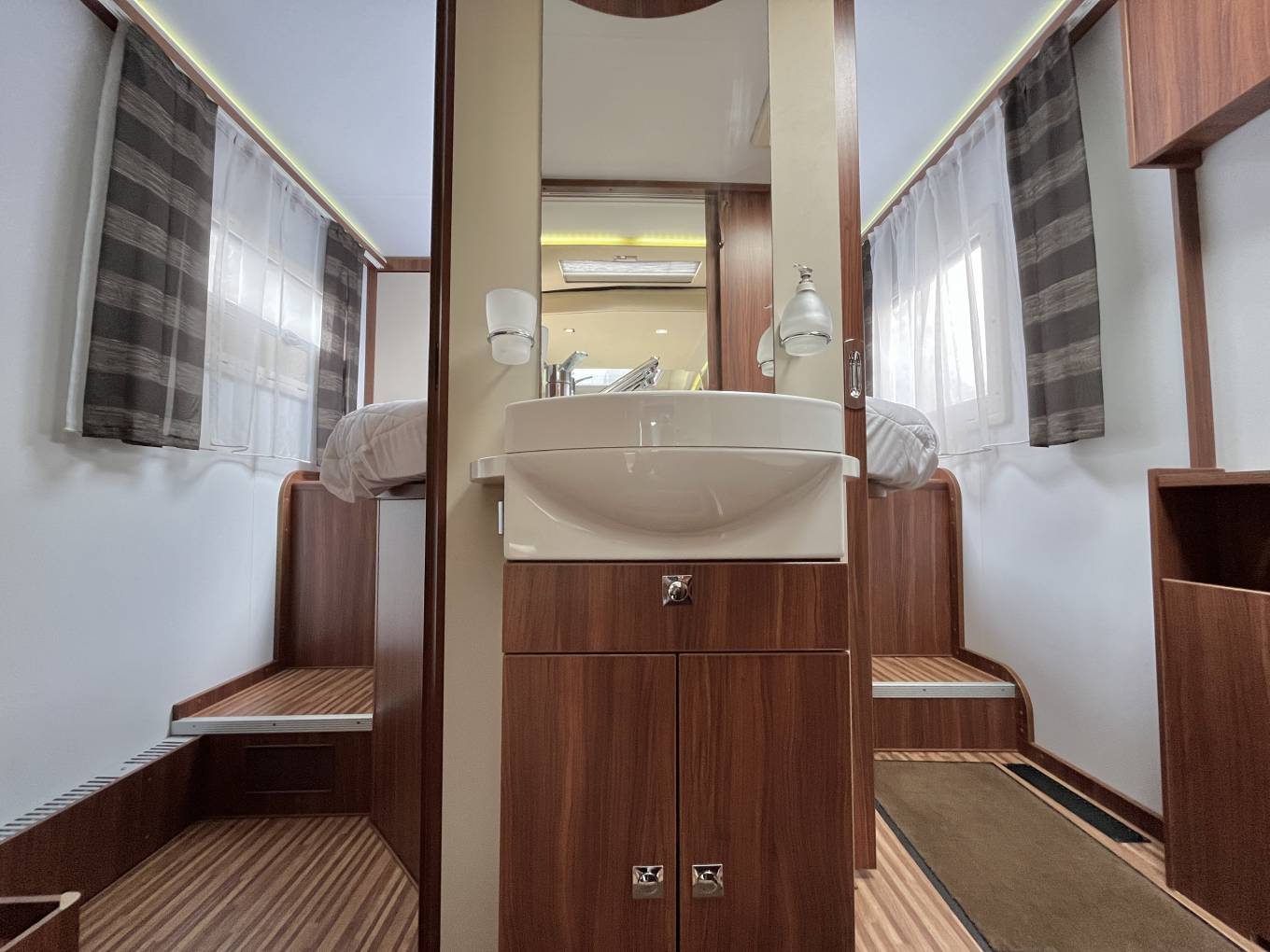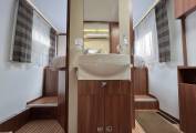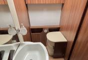 This Adria motorhome is a high quality tourer for those who prize their comfort on the road, as you enter the van you will see the spacious front lounge / diner easily able to accommodate 6 people for socialising, dining or TV, this area also includes two 3 point seat belts and a lap belt for rear passenger travel when required. The adjustable table can also be lowered to create an occasional single bed, and above the lounge is a large electric drop down bed. Underfloor heating and van heating is provided by an Alde system.