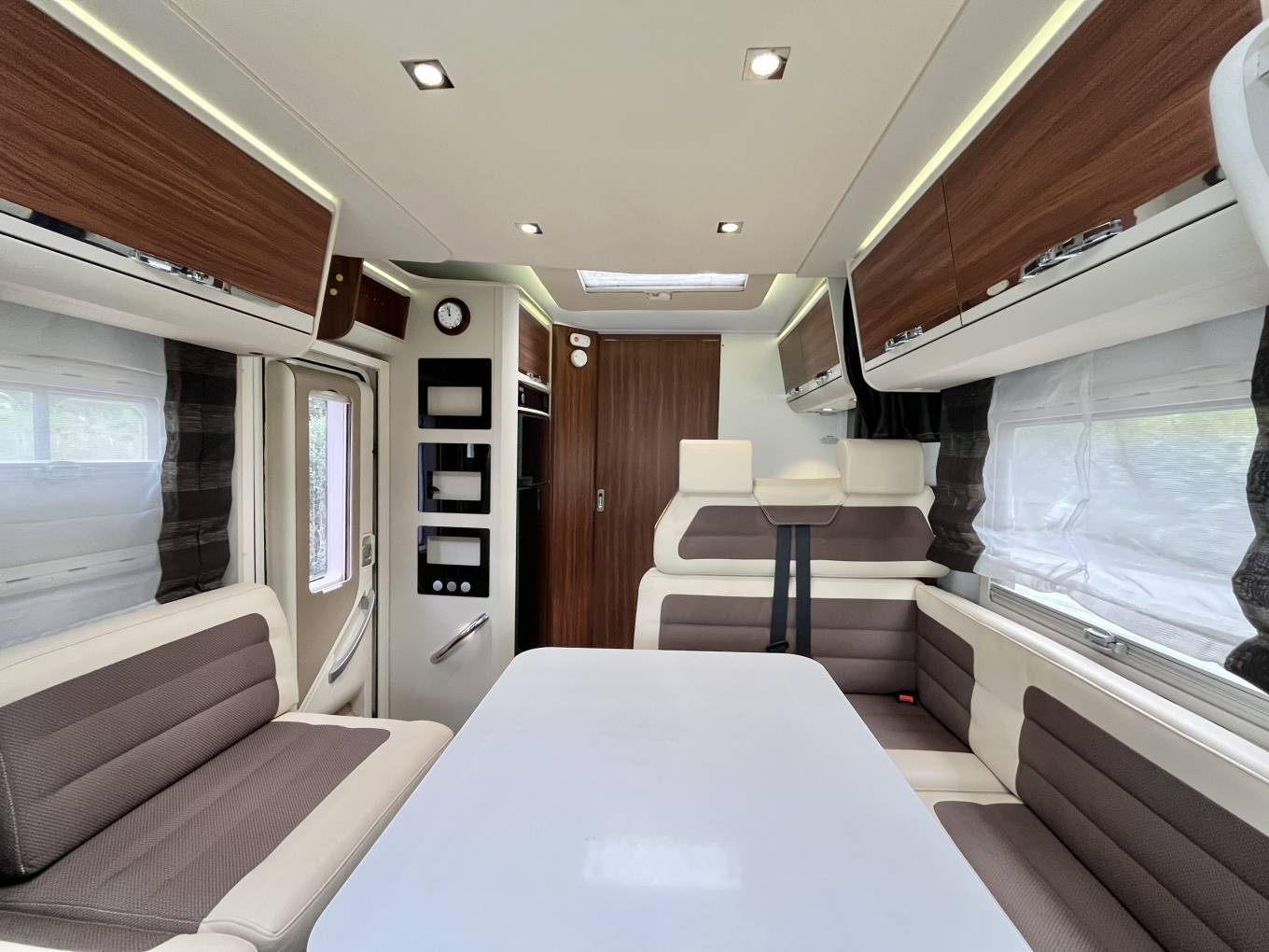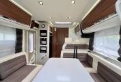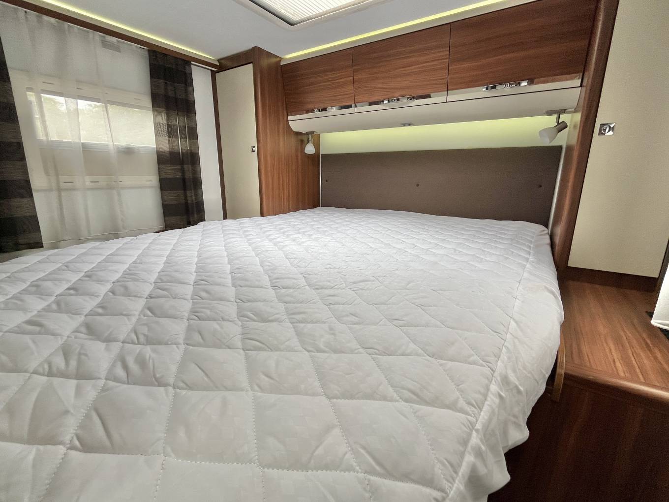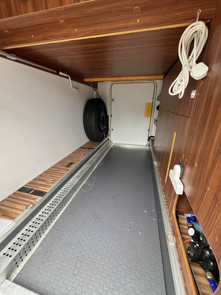 Finally in the cab area we have Cab and windscreen blinds, air conditioning, cruise control, adjustable media screen with Apple Carplay / Android Auto, swivel captains seats, reversing / rear view camera, front dash cam and TomTom navigation unit. To the exterior we have a large twin door garage with full size spare wheel, alloy wheels, gas locker with bottle, wind out awning, Air Top suspension to the rear, rear wind down steadies, rear ladder, reversing camera and rear parking sensors.