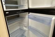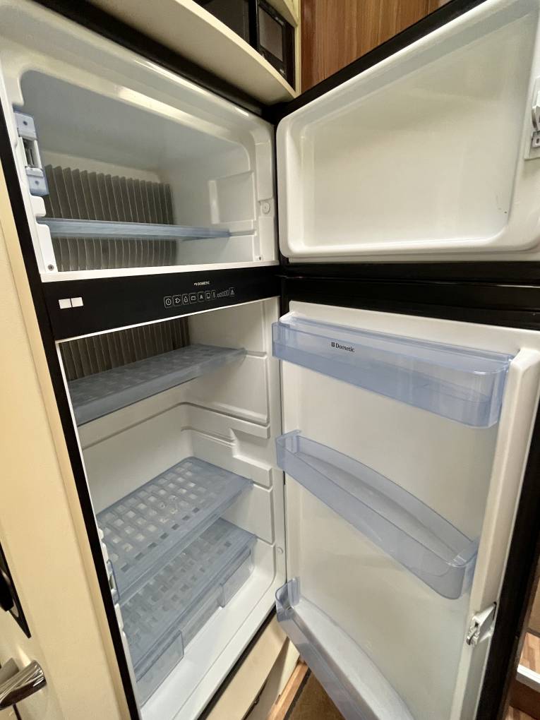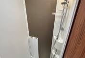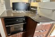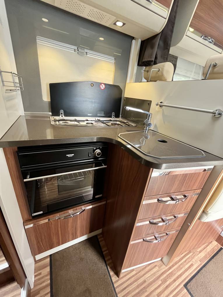 Behind the lounge is the kitchen area comprising of 3 burner hob with extractor fan, sink with hard covers and hot/cold mixer tap, combination oven and grill and a large fridge with separate freezer unit along with good storage options both above and below. There is a rear sliding door to separate the kitchen/lounge and dining area from the centre washroom and rear bedroom.