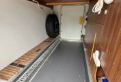 At the rear of the van we have the large well lit bedroom with full size raised island bed, twin wardrobes and three overhead storage lockers there are also two side windows and a large sky light. At the base of the bed on the right there is a small button that activates a good sized hidden wardrobe with hanging facilities to electronically rise by lifting the bed base.