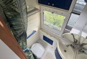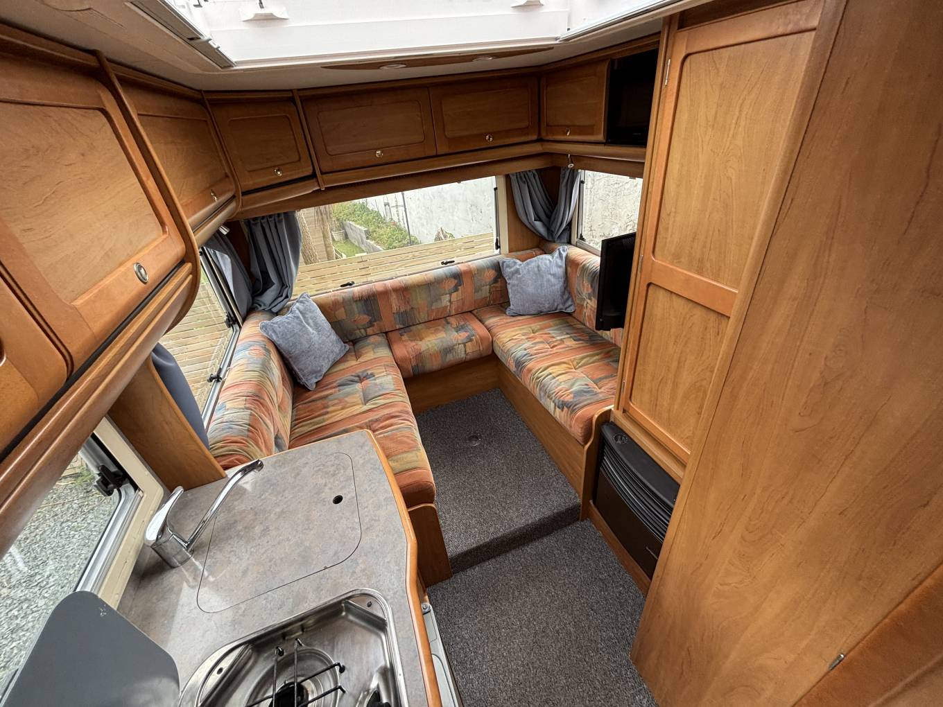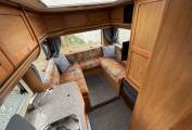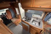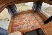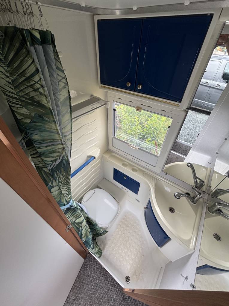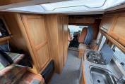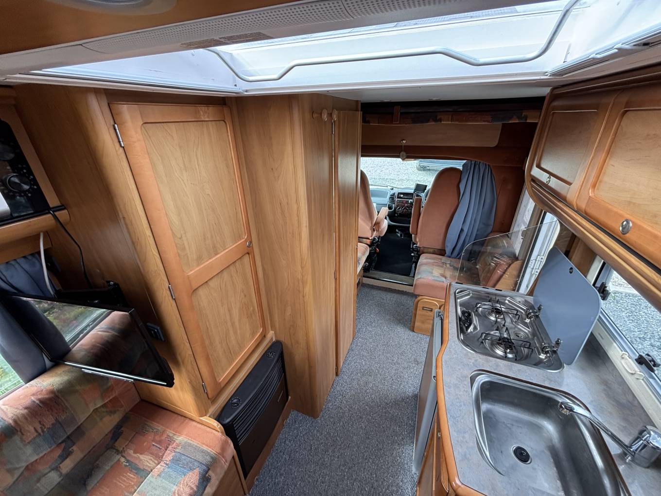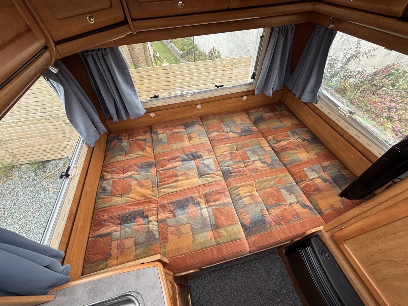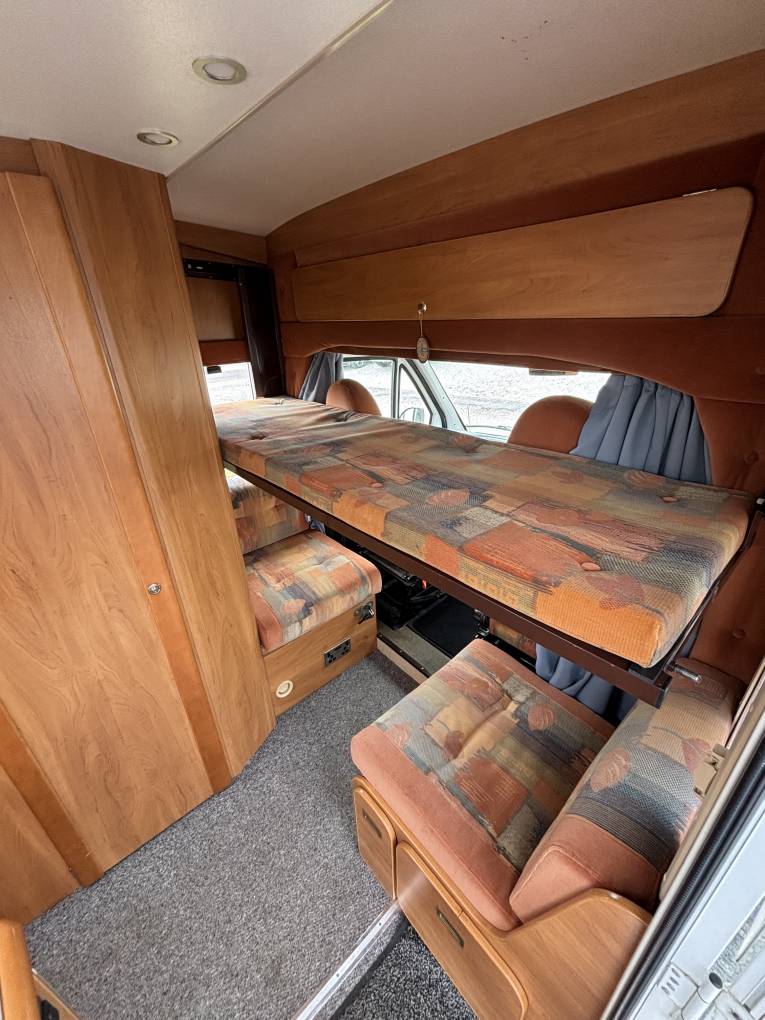 Layout - To the front we have two single side bench seats which convert into a single bed and above these there is a drop down single bed giving you 2 of the 4 berths available in the Motorhome. We then move onto the washroom which comes with a corner vanity style wash hand basin complete with a shower tap and a cassette toilet. Facing the washroom we have the kitchen area which comes with a 3 way fridge, including a small freezer compartment, a 2 burner gas hob and a sink with hot and cold running water.