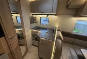 The layout from the centre habitation area is made up of an L shaped corner sofa, a side facing double sofa and the front two seats that swivel round to create a wonderful area to relax in with all of the upholstery in opulent cream leather and in the centre is a large multi-directional table with this area at night easily converted to make a double bed. Above this area is an electric drop down double bed that can be raised and lowered at the touch of a button. At the rear there is a large full width transverse ensuite washroom with Thetford Flush cassette toilet, sink, separate shower and plenty of cupboard and wardrobe space to keep all your clothes. The motorhome comes with a well equipped kitchen including Thetford Triplex Oven and Grill, hob with 3 gas burners, sink with sliding cover and large fridge with freezer.