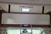 The kitchen is to the rear of the vehicle, with a hob with three gas burners and an electric plate, a sink, an oven, a grill. There is a microwave, and a fridge with a freezer box beside the habitation door.