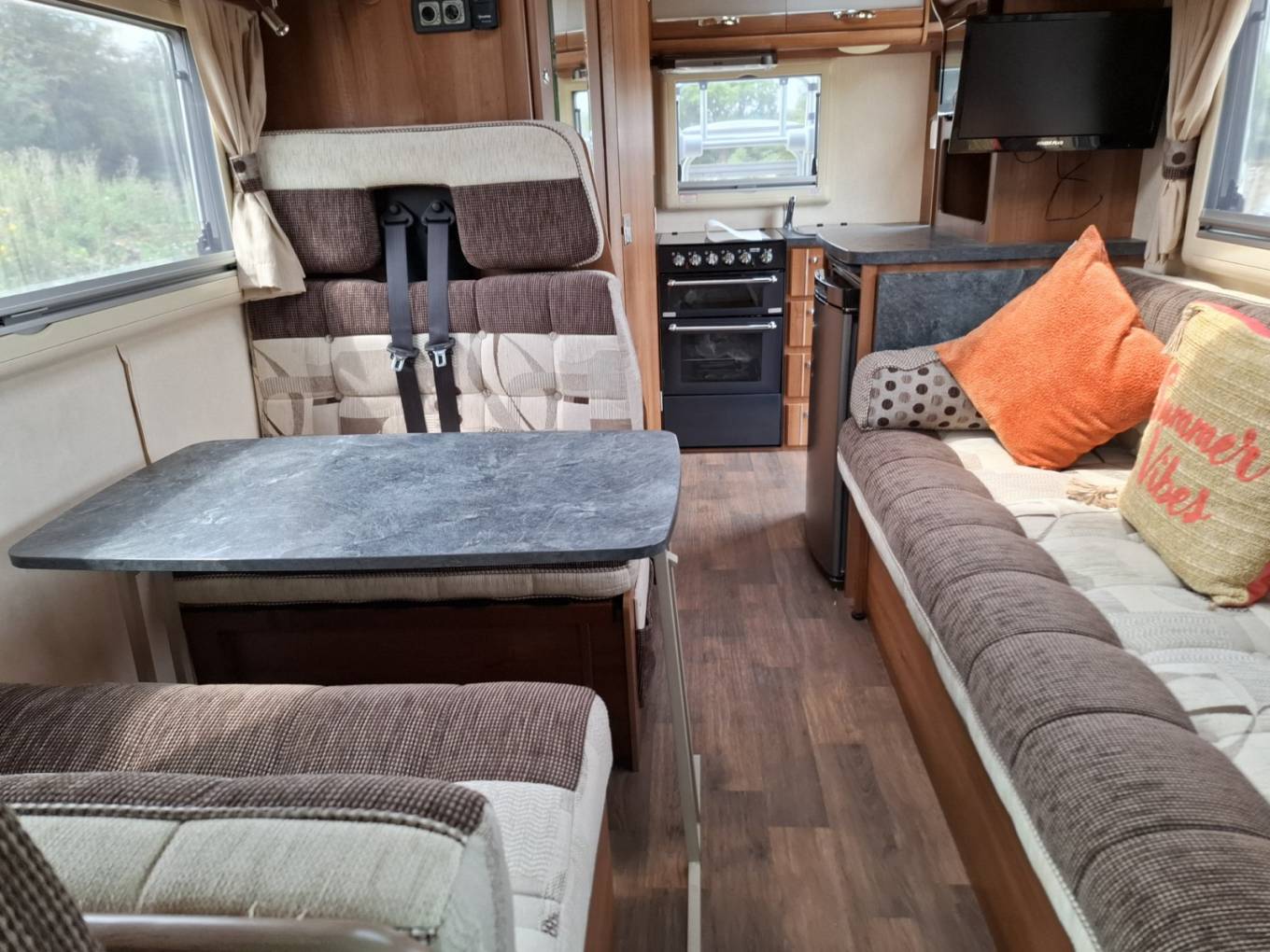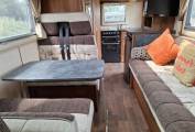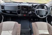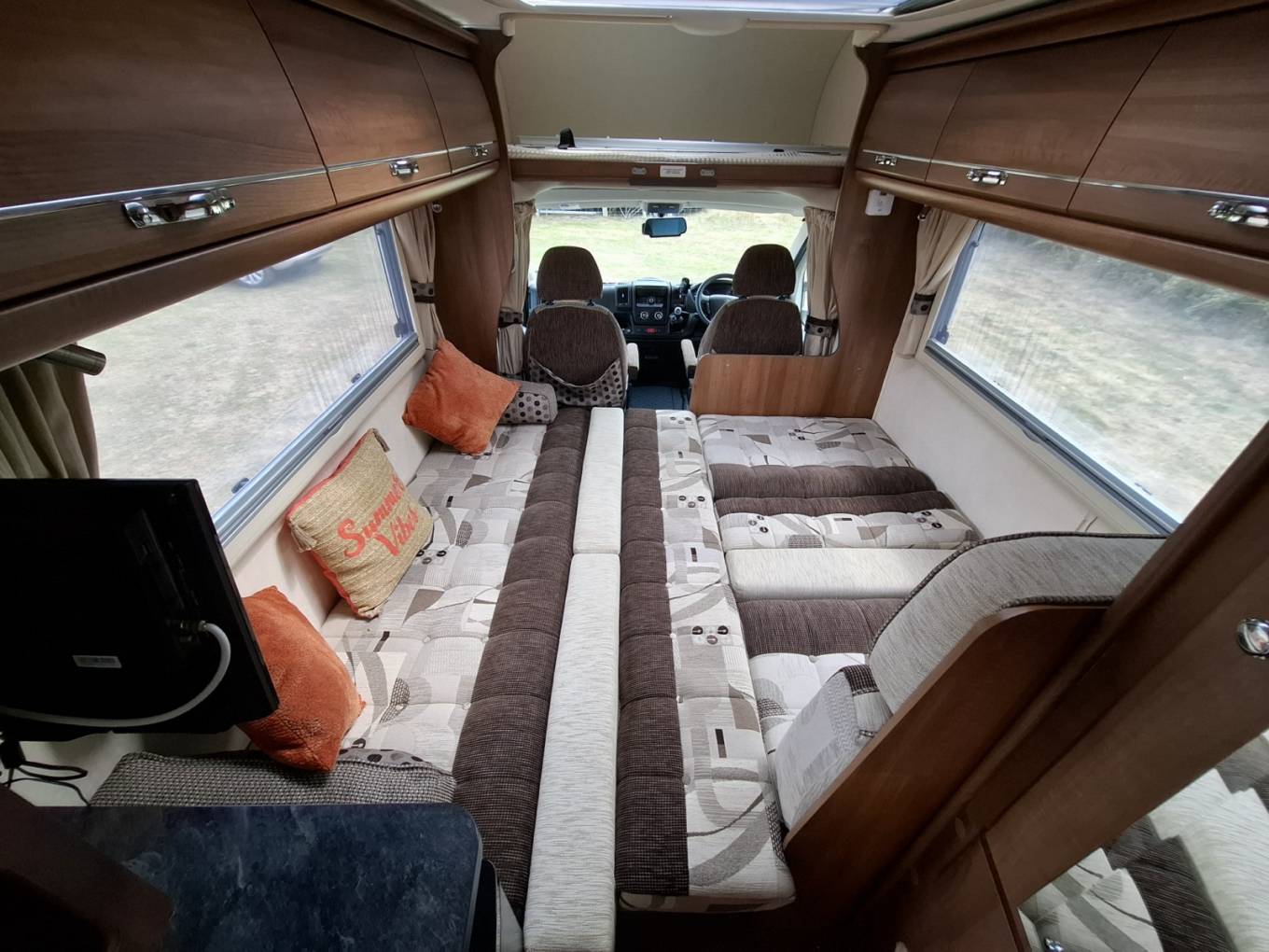 Behind the cab is a large leisure/dining area with an offside full dinette (complete with two additional forward facing seat belts), and a long nearside side sofa. The seating can be readily converted into either a large transverse double berth, or a smaller double berth and a single berth,