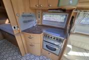 Conveniently adjacent for preparing and serving food, the central kitchen features a hob with 4 gas burners, a grill and an oven beneath an extractor fan, together with a microwave and sink. Opposite there is a large fridge and separate freezer.