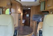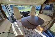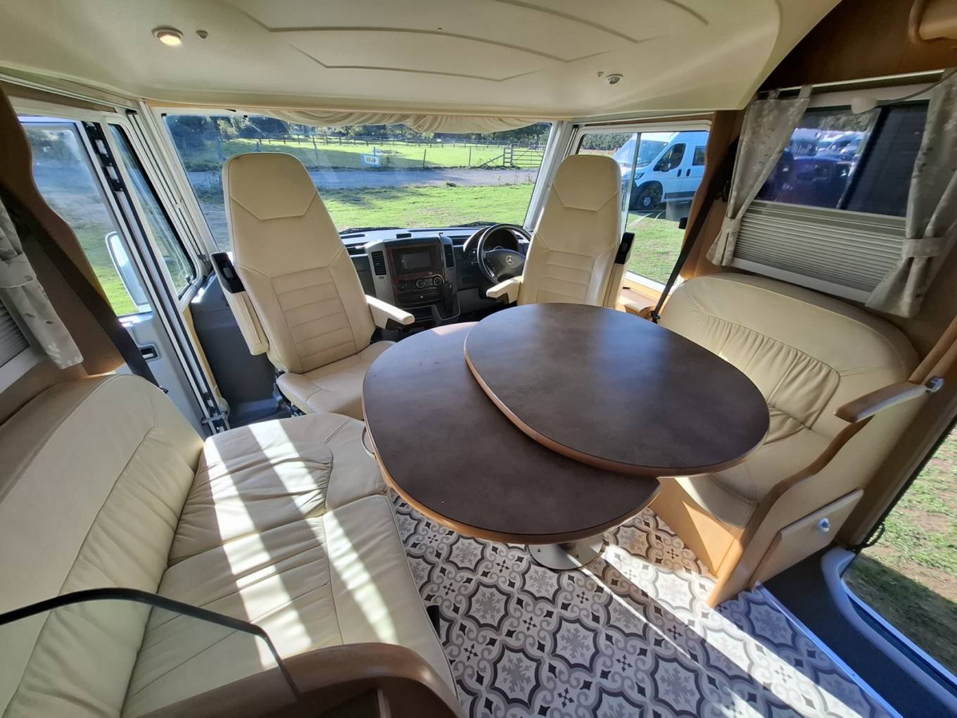 As an A-Class vehicle, the cab delivers panoramic viewing on the journey, and contributes to a spacious and comfortable dining, entertaining, and sleep experience. With the pull down double bed raised, the coordinated leather cab seats can be swivelled to join those seated either side of an adjustable and extendable central table behind the cab.