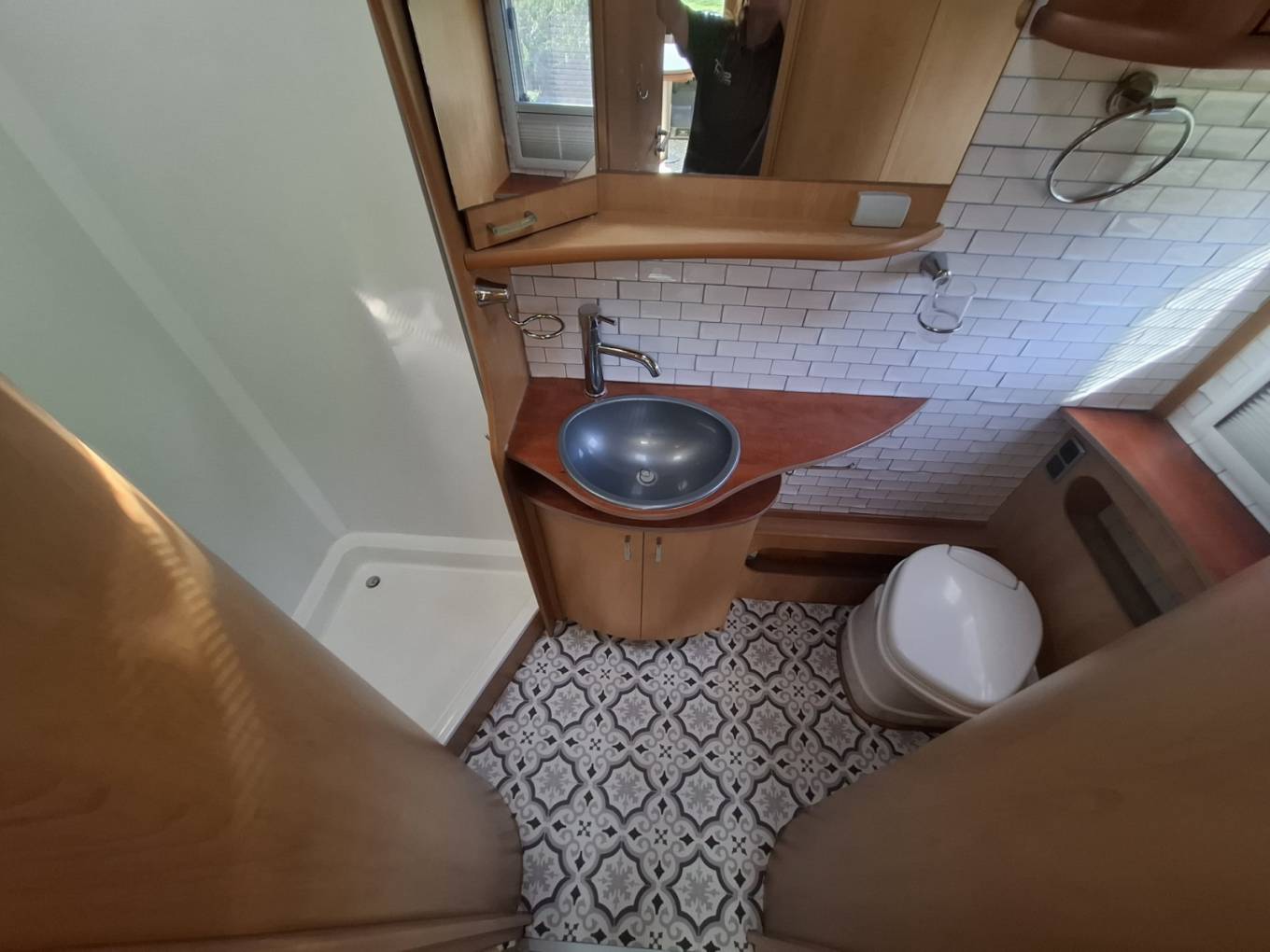 The bathroom stretches across the entire width of the vehicle rear, providing plentiful space for the toilet, the wash basin, and the separately screened shower.