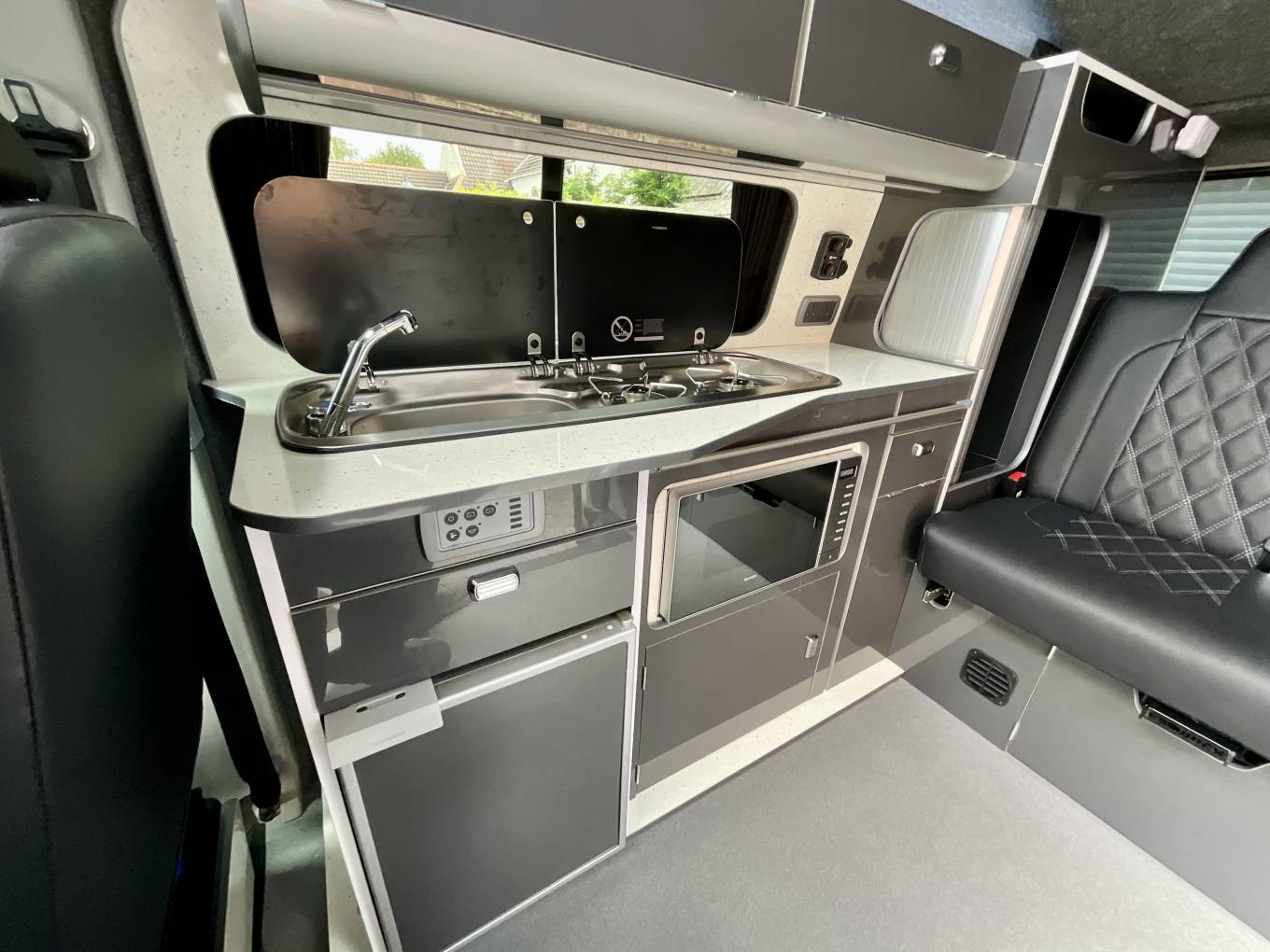 The kitchen area is fully equipped with fridge/freezer unit, gas hobs, microwave, and sink with water pump that draws water from the onboard water tank. There's plenty of storage throughout.