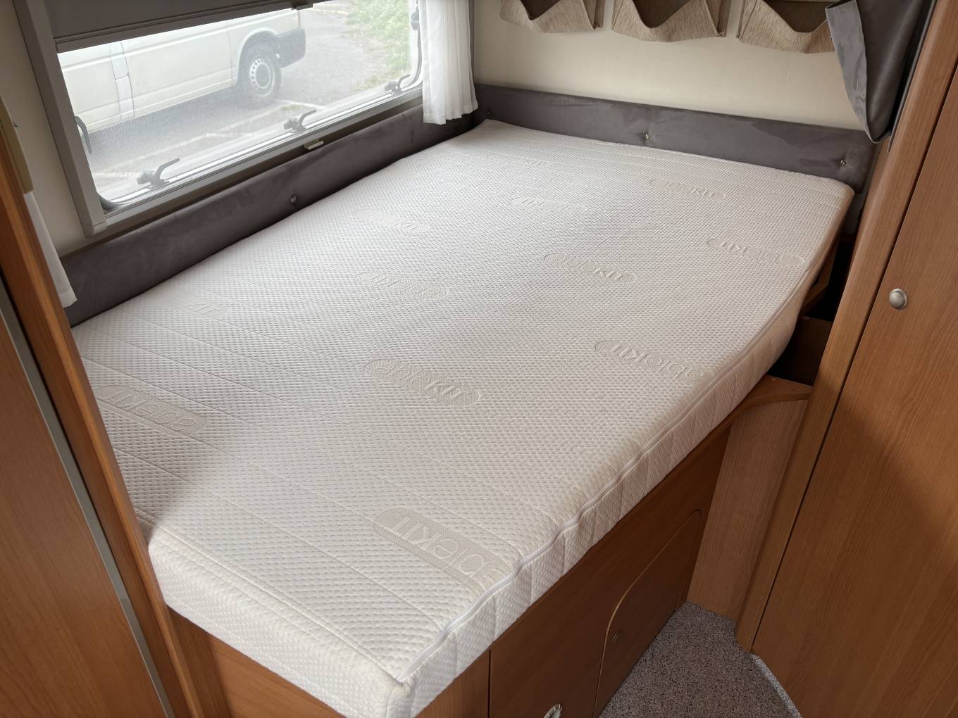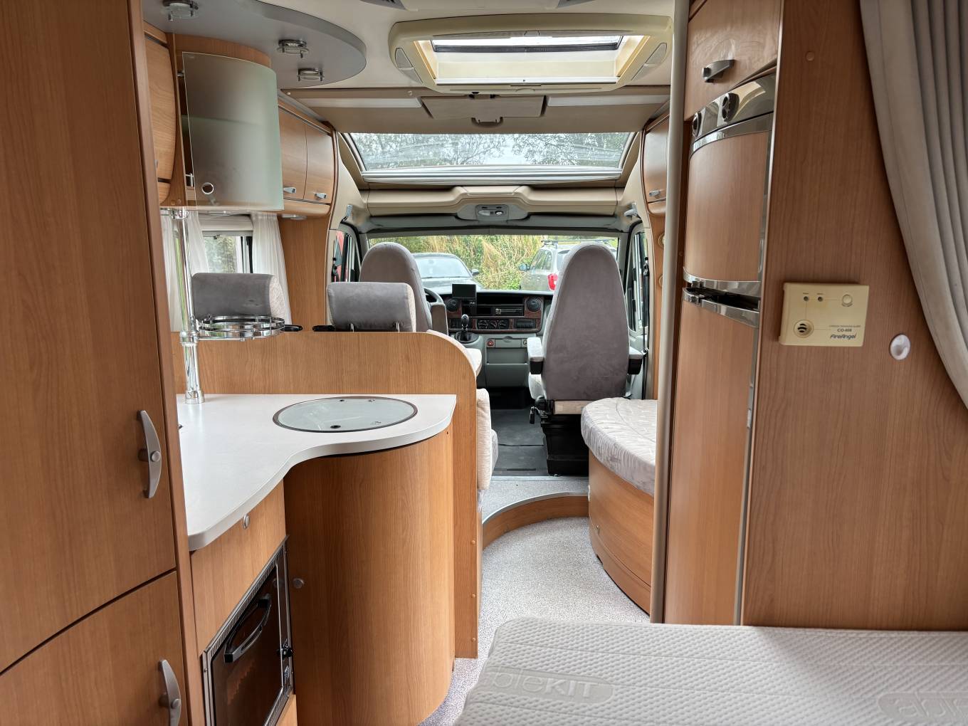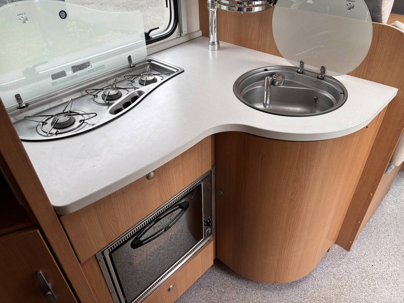 The centre kitchen is fully equipped with sink, 3 gas hobs, oven, grill, and a large fridge freezer, making meal preparation a breeze while on the road. Opposite, the front dinette converts into a smaller double bed to complete the sleeping arrangements for four.