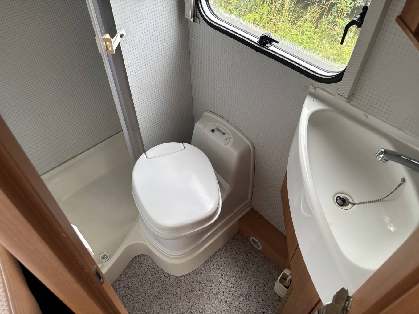 At the rear, you’ll find a fixed French double bed for easy nighttime comfort, situated next to a large rear washroom with sink, toilet, and a separate shower cubicle—a layout that offers both space and privacy.