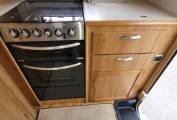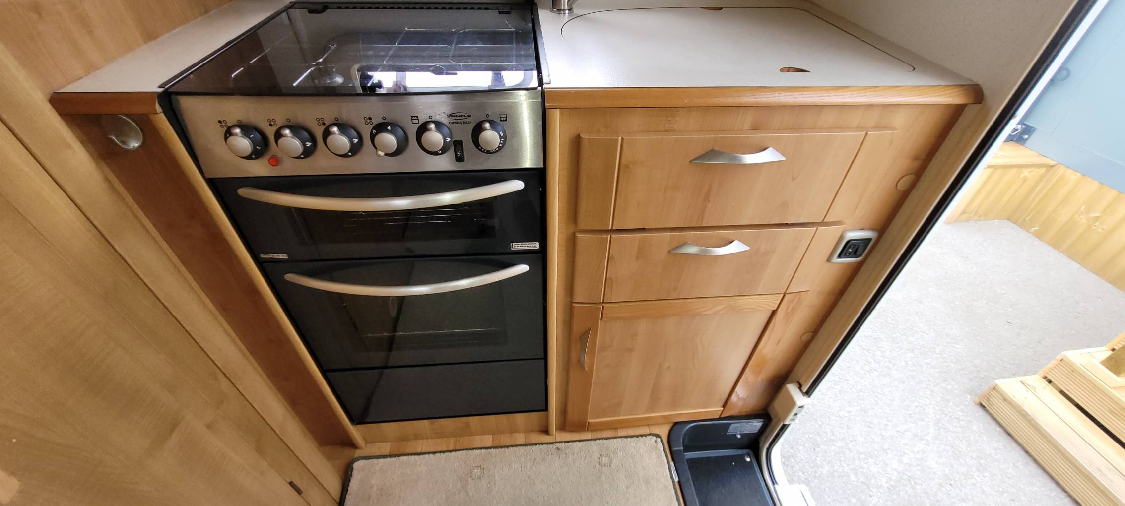 Fully equipped kitchen featuring a full oven, grill, hob, and a three-way fridge.