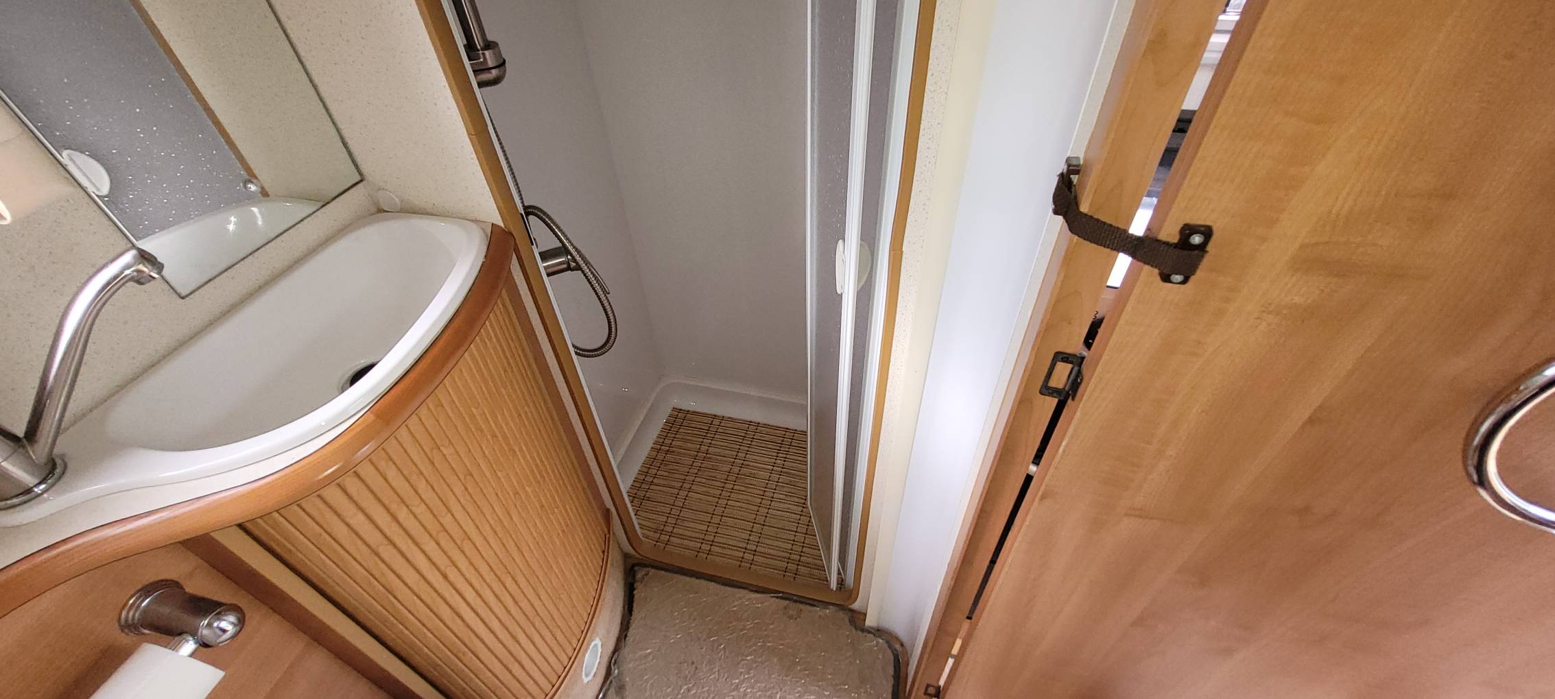 Washroom includes cassette toilet, sink, and separate shower cubicle.
