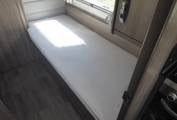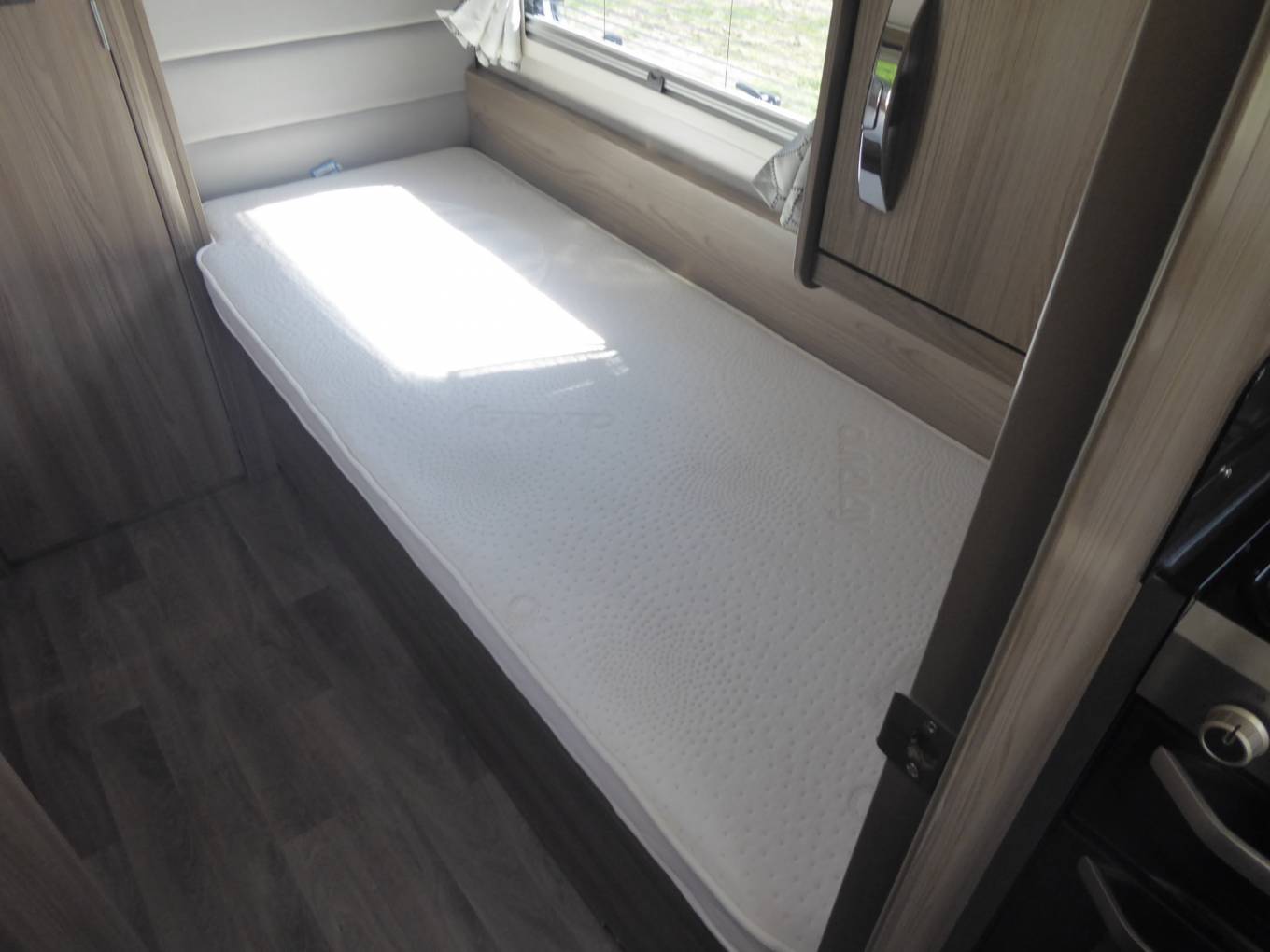 Rear bedroom with opposing single beds and ample storage space above and access to external lockers from under the beds
