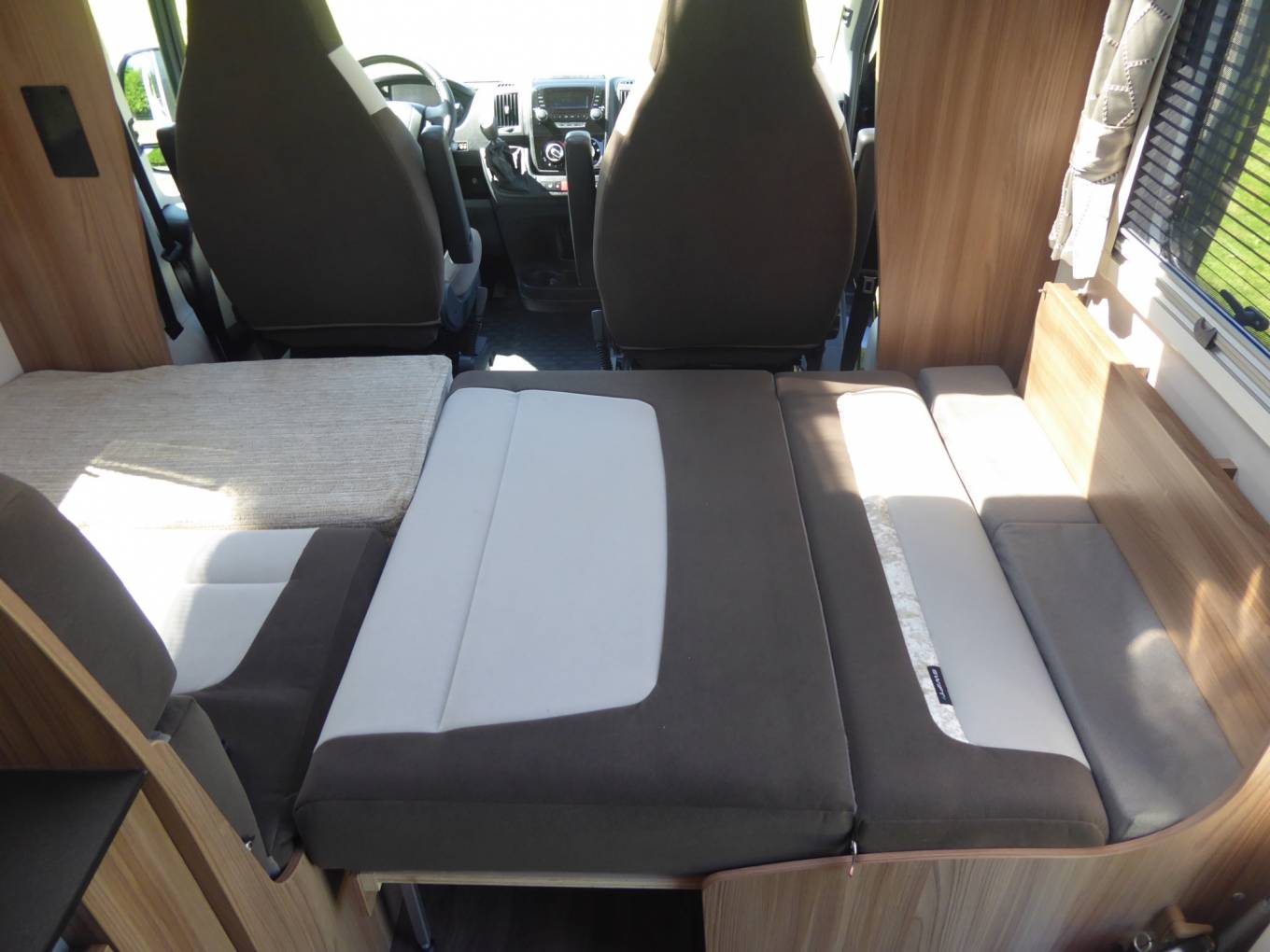 Four berths with swivel cab seats combined with a forward-facing seat and side sofa that convert into a double berth. Two single beds in the rear bedroom, oriented opposite each other