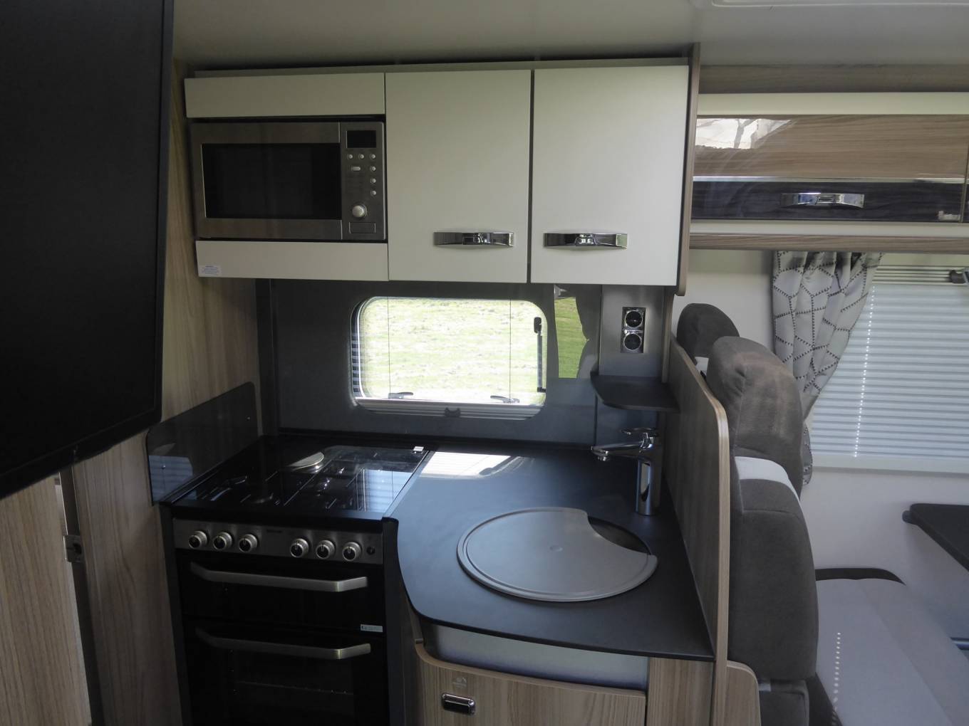 Centrally located galley equipped with a sink, oven with grill, a hob featuring three gas burners and one electric plate, a microwave, and a fridge with freezer box