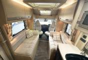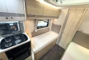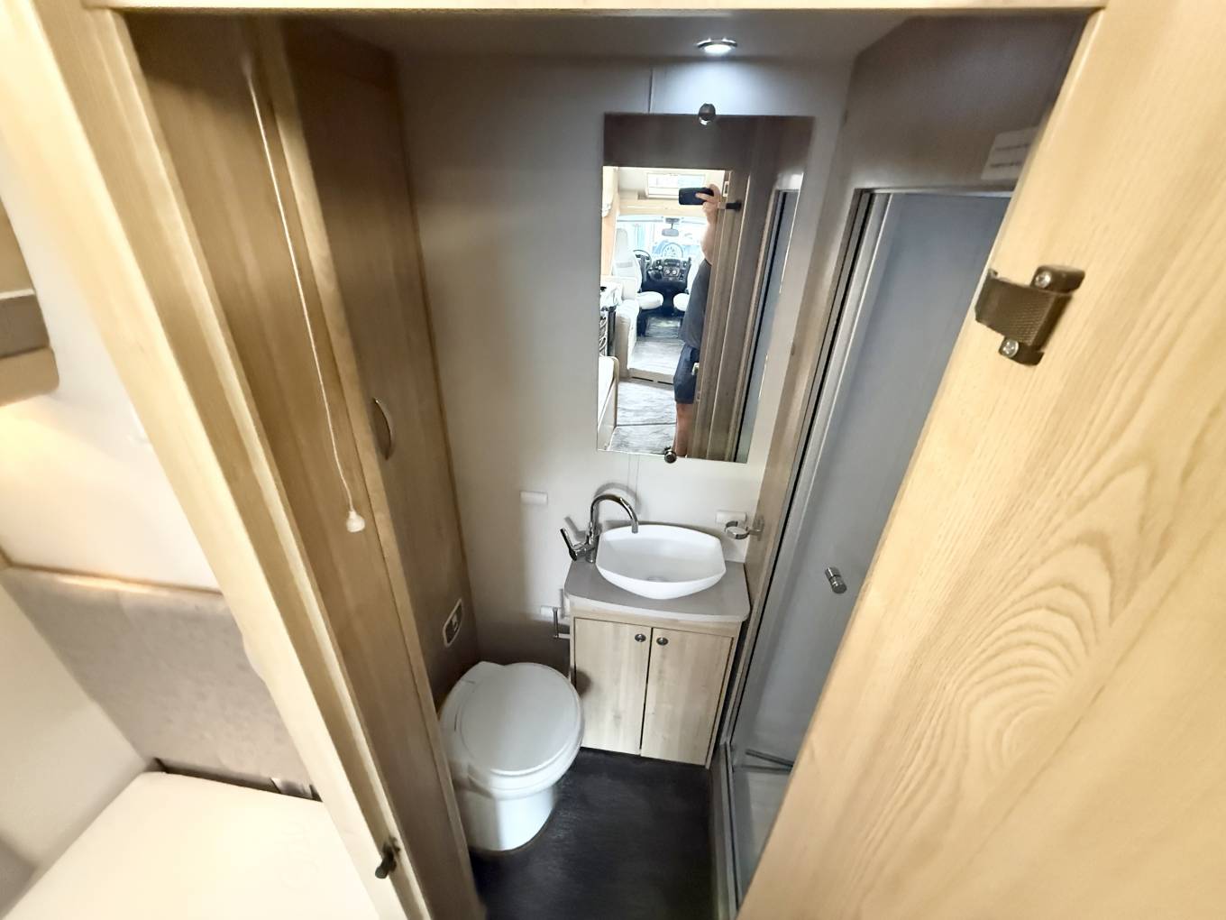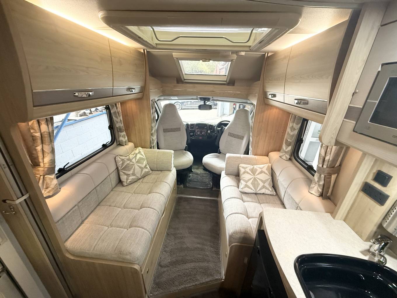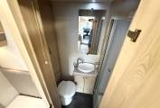 finished with the metallic gold cab and dealer upgraded upholstery this model really stands out from the crowd. This layout, with 2 single fixed beds at the rear and large lounge at the front gives a fantastic feeling of space.The front passenger seat swivels making it a perfect socialising area. Moving to the back of the motor home there are 2 fixed single beds with ample high level storage cupboards and wardrobe. To the right of the bed is a spacious light and modern washroom, consisting of toilet, separate shower, vanity units and washbasin. Each window has fly screens, blackout blinds, curtains and voile curtains. There is ample lighting throughout the motor home making it nice and light. the front bench seats can be lifted to reveal 2 extra AGUTI folding belted travelling seats... Very clever.