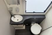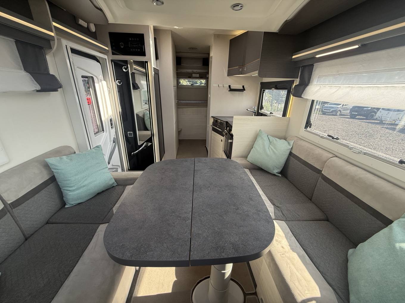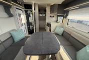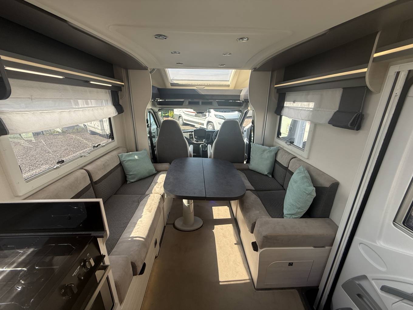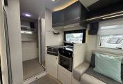 From its rear you have a large garage with external access on both sides, ideal for storing bikes, toys, or other family travelling essentials over single modern bunk beds that can be manually and electronically adjusted to give more room for either storage or bed space, moving forward you have the well-laid-out kitchen which is fully equipped with a 2 gas burner hob and an electric plate, oven, sink, and a large fridge/freezer. The spacious and light lounge has 2 bench seats sitting across from each other with an electric height adjustable dining table for eating at or for socialising with an electric drop down double bed above. This area has an Avtex TV and the 2 cab seats swivel.