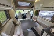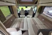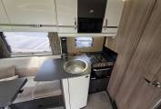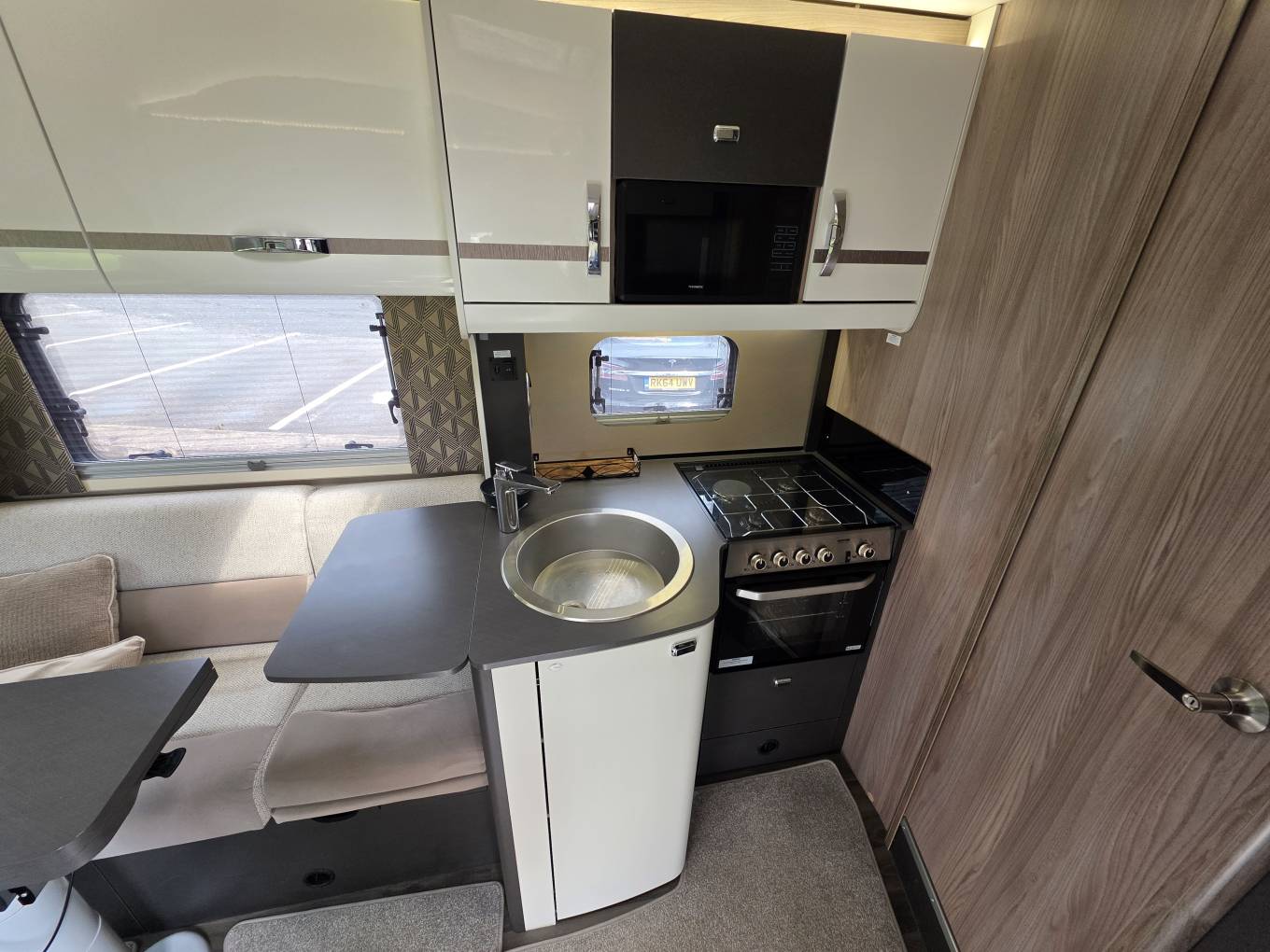 In the middle of the motorhome is the kitchen, there is an oven and grill combi, 3 gas burners and electric hob, a sink, tall fridge freezer, with plenty of storage surrounding, plus microwave and useful pop up worktop giving additional worktop space when needed.