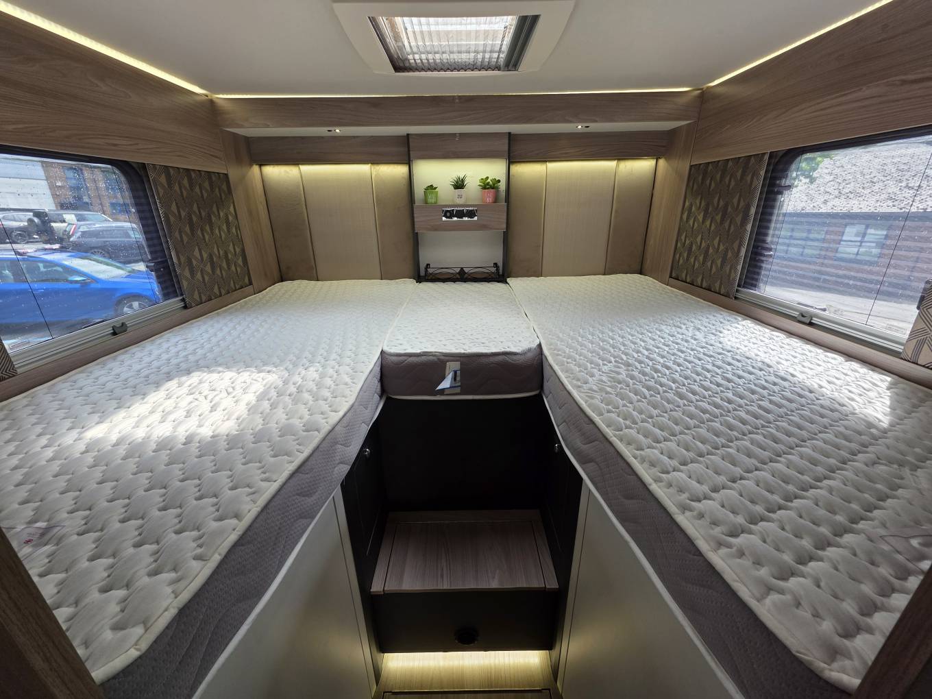 At the rear is the comfy fixed single beds, with ample storage above and below, 2 windows and a sky light.