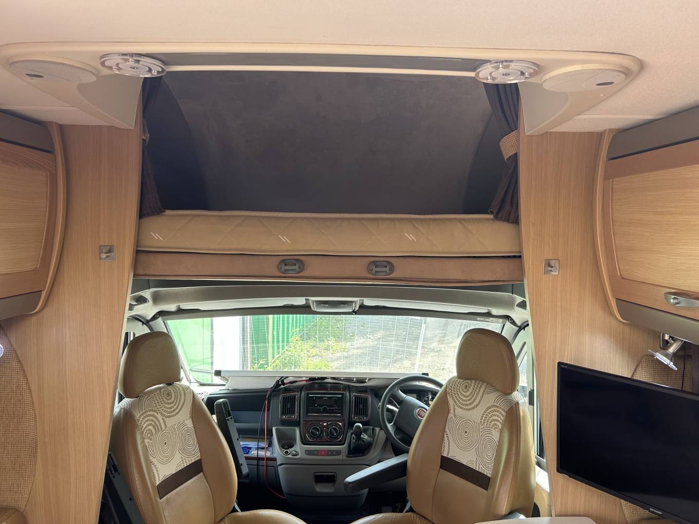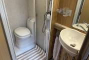The 765p is extremely comfortable to sleep in with a fixed French bed at the rear so no need to keep making your bed up at night. There are two further doubles in this motorhome with a large over the cab bed and the two side sofas making up the third double - so you will have plenty of space to spread around or invite guests or grandchildren to stay. The motorhome has a good sized washroom at the rear which features a flush cassette toilet, sink and shower with two splash screens. The motorhome has loads of internal storage throughout - with a large hanging cupboard, lots of overhead lockers, draws and a large storage space underneath the French Bed. Heating and hot water is provided by the excellent Truma heating system keeping you extremely warm and cosy at this time or year but it also benefits from the Habitation Air Conditioning - that will keep you nice and cool in the summer.