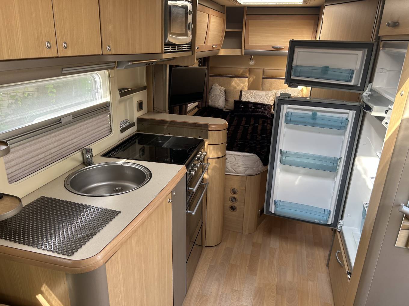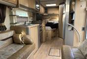 As already mentioned, this motorhome has an excellent living space with the large front lounge area being made up from 2 double side facing sofas and the front two seats that swivel around. There is a small coffee table but the motorhome also has a further larger free standing table that can go in the centre, creating an ideal space to enjoy a meal, snack or even board games or cards. This area is extremely comfortable with sofa furnishings, all in good condition for its age. Moving back you have an extremely well equipped kitchen with plenty of space to prepare a full meal or snack. It comes with oven, grill, hob with 3 gas burners and an electric hotplate, microwave oven, sink with mixer tap and a large fridge with separate freezer.