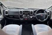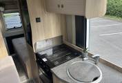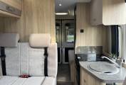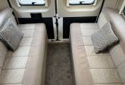 The layout of this motorhome is particularly popular with it having plenty of dining space at the front as well as the rear lounge set up. With both swivel seats at the front, you can have four people dining on the table which also extends out. This also transitions into a single bed which is quick and easy to set up. You will find the well-equipped kitchen towards the middle, this comes with a large Thetford T1000 fridge/freezer, Thetford Triplex Oven/grill, 3 ring burner hob, sink/mixer tap and a fold out table. The washroom is located behind the kitchen and is fitted with a shower and curtain, toilet with electric flush, sink/mixer tap, cup holder, vanity mirror and cupboards. Lastly, you have the rear lounge with bench seats. This converts into the double bed which is incredibly quick and easy to make up and is particularly spacious. Storage options are plenty throughout, with overhead lockers in the front and in the rear lounge. You will find a cupboard unit in the centre of the van which has been fitted with drawers and there is also the option of using the rear bench seats for additional storage.