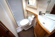 The washroom is to the rear of the vehicle with separate shower unit, toilet, sink and vanity unit.