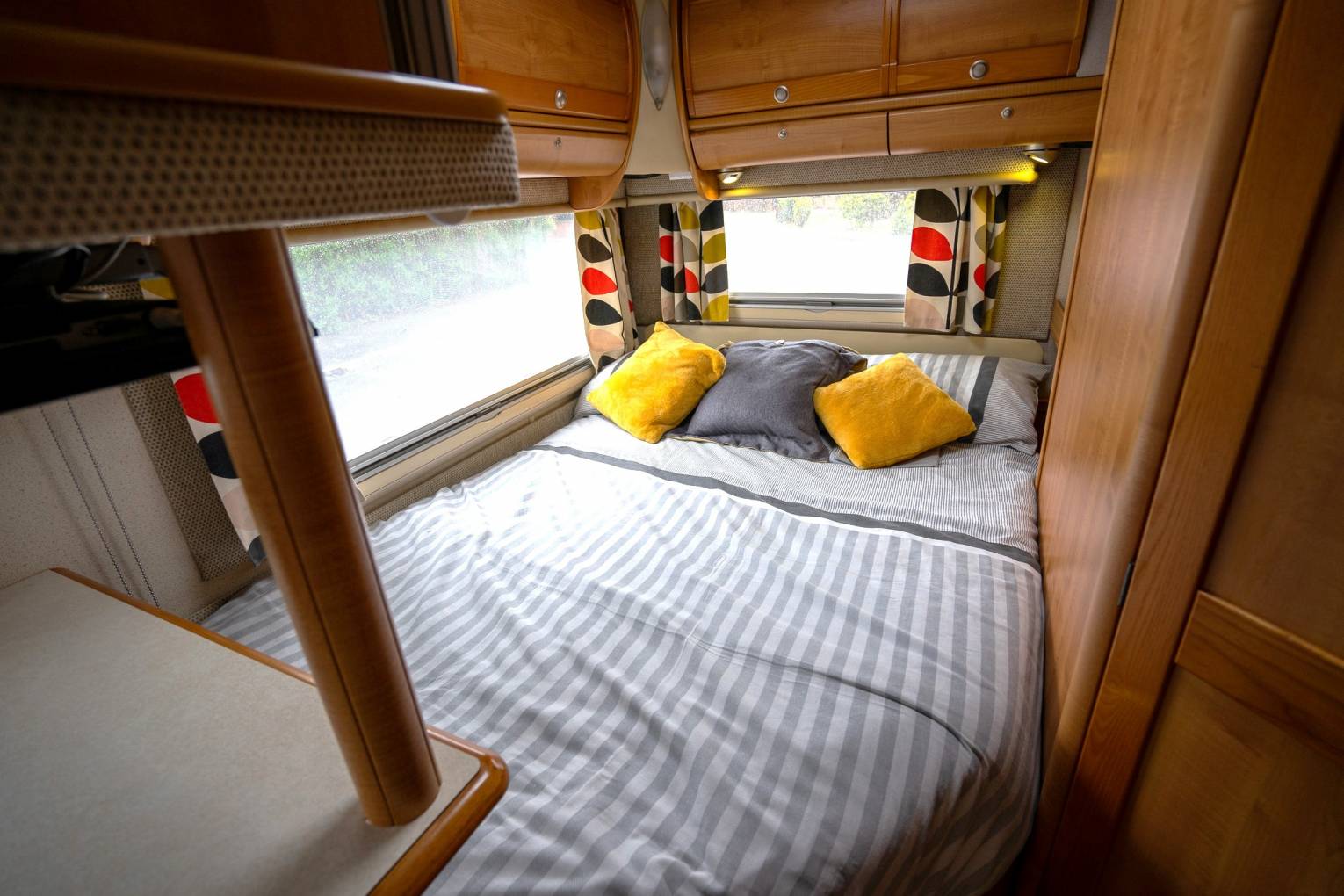 To the rear of the vehicle, you have the popular French double bed with storage underneath that can be accessed internally and externally. You have a swivel tv bracket fitted with TV and DVD Player. This area can be privatised with a shutter door.