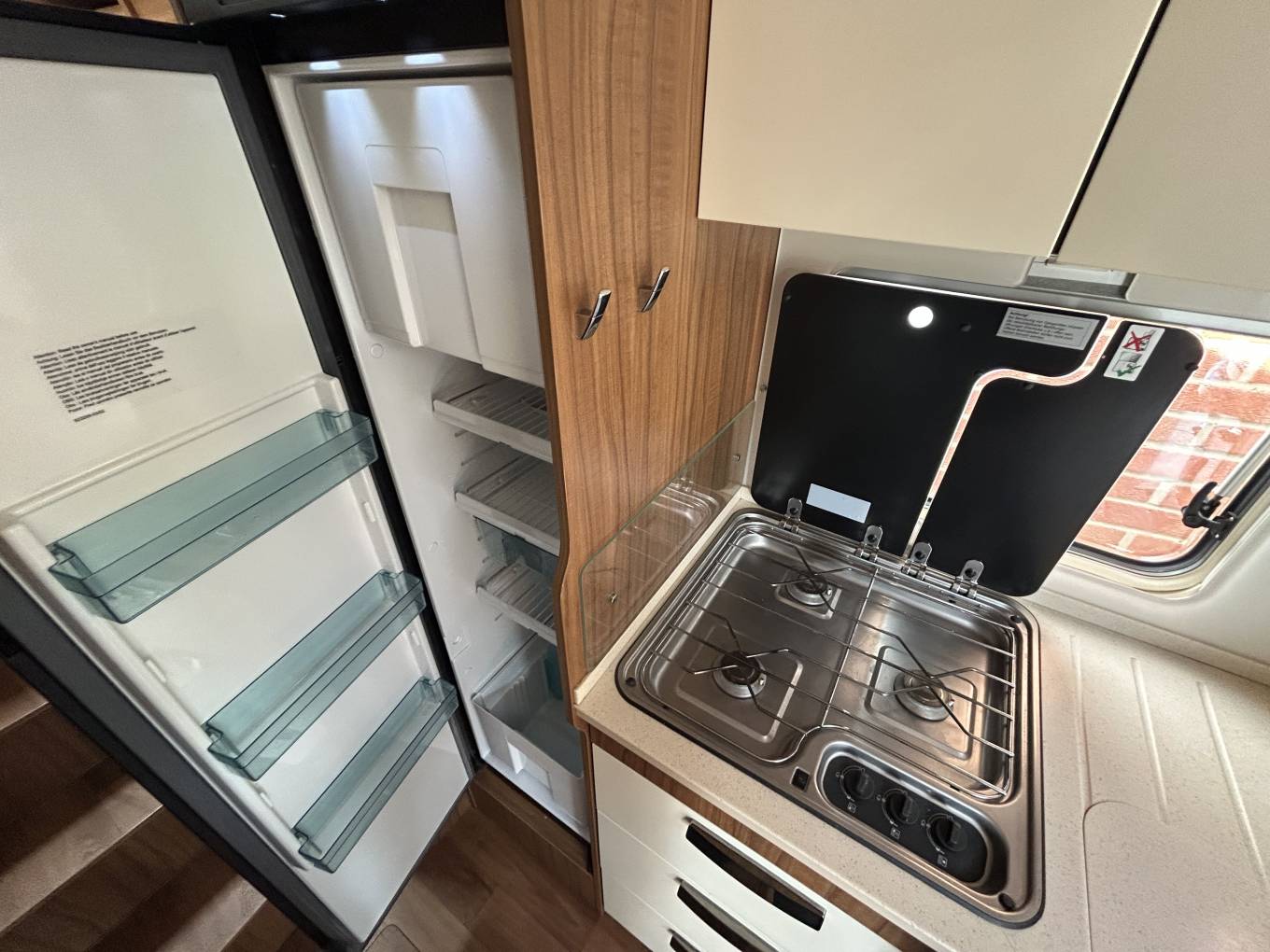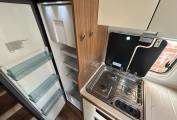 The motorhome has a wonderful interior and is presented in excellent condition throughout. At the front you has a spacious lounge area that makes use of the two captains chairs and has an L-shaped sofa and a further single sofa. In the centre there is a multi-directional table giving you the ideal space to relax or enjoy a meal or snack. You can also sit and watch the LED tv/dvd and the motorhome comes with the Oyster 85 satellite dish. Moving back this Hymer comes with a central kitchen including gas hob, sink with mixer tap and large 3-way fridge with separate freezer.