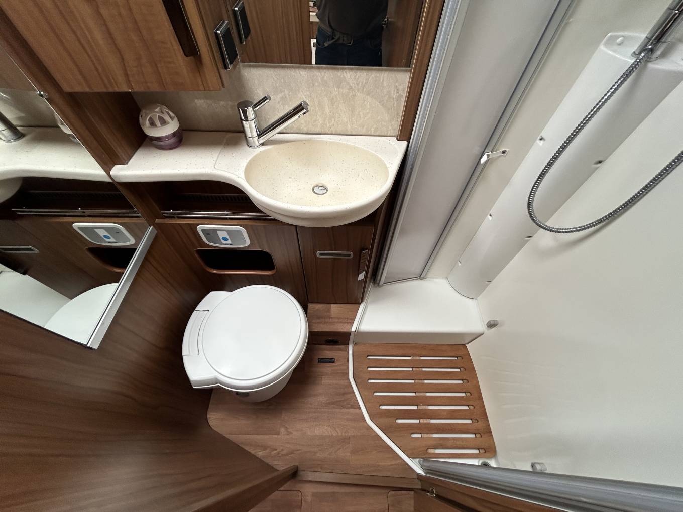The Hymer is perfect for sleeping and has rear fixed single beds that can be made into one enormous double. There is a further large drop down double at the front of the motorhome and all beds benefit from the Froli spring system. There is a good sized washroom that has a cassette toilet, sink and separate shower with wooden fill in tray. Heating and hot water are provided by the Truma system.