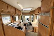 The interior layout includes a front lounge with swivel captain seat and a central kitchen with hob, grill, oven, fridge freezer and microwave. At the rear is a large bathroom which houses a cassette toilet hand wash basin and a separate shower.