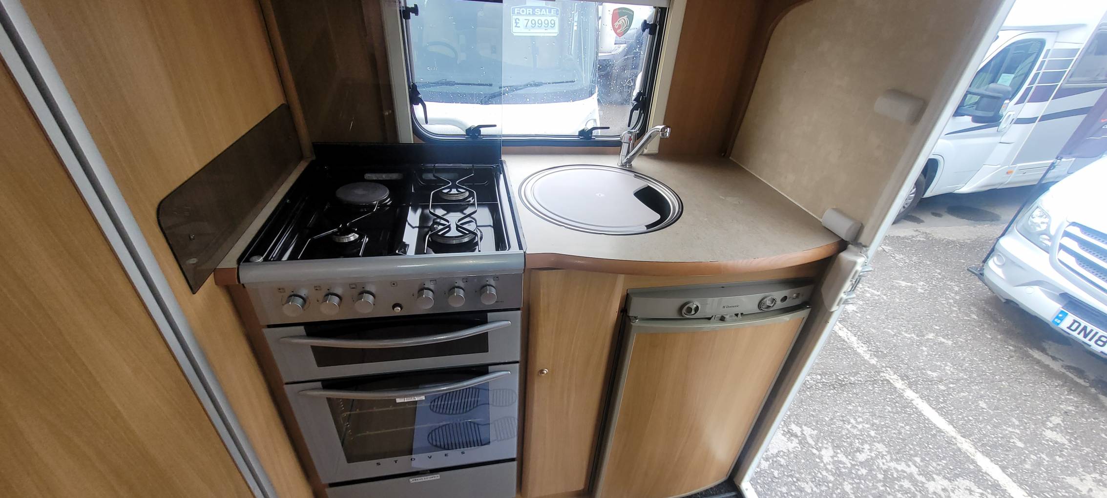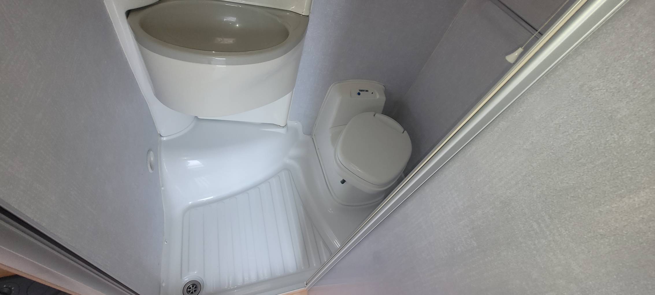 Inside, you'll find a spacious front lounge that easily converts into a large double bed, perfect for relaxing after a day on the road. The central kitchen features a full oven, hob, grill, and fridge, while at the rear, you’ll find a bright and practical washroom with a cassette toilet, hand basin, and separate shower—ideal for comfortable touring in all seasons.