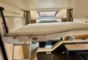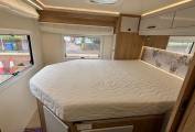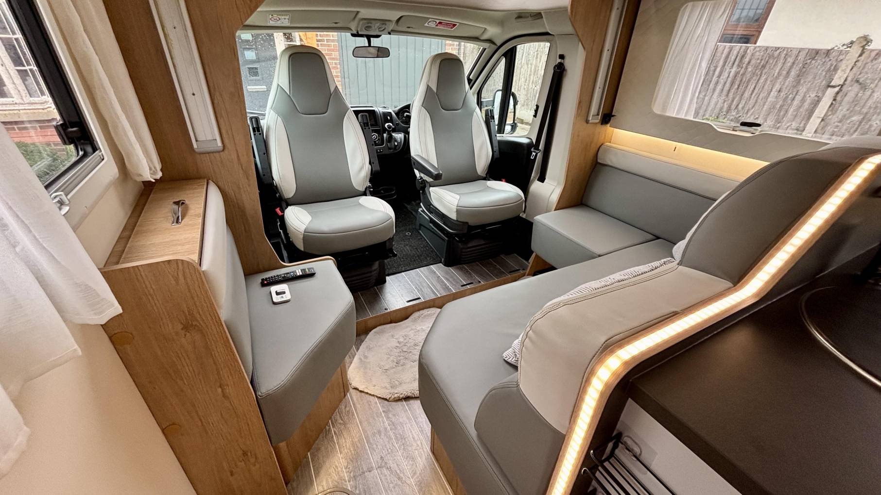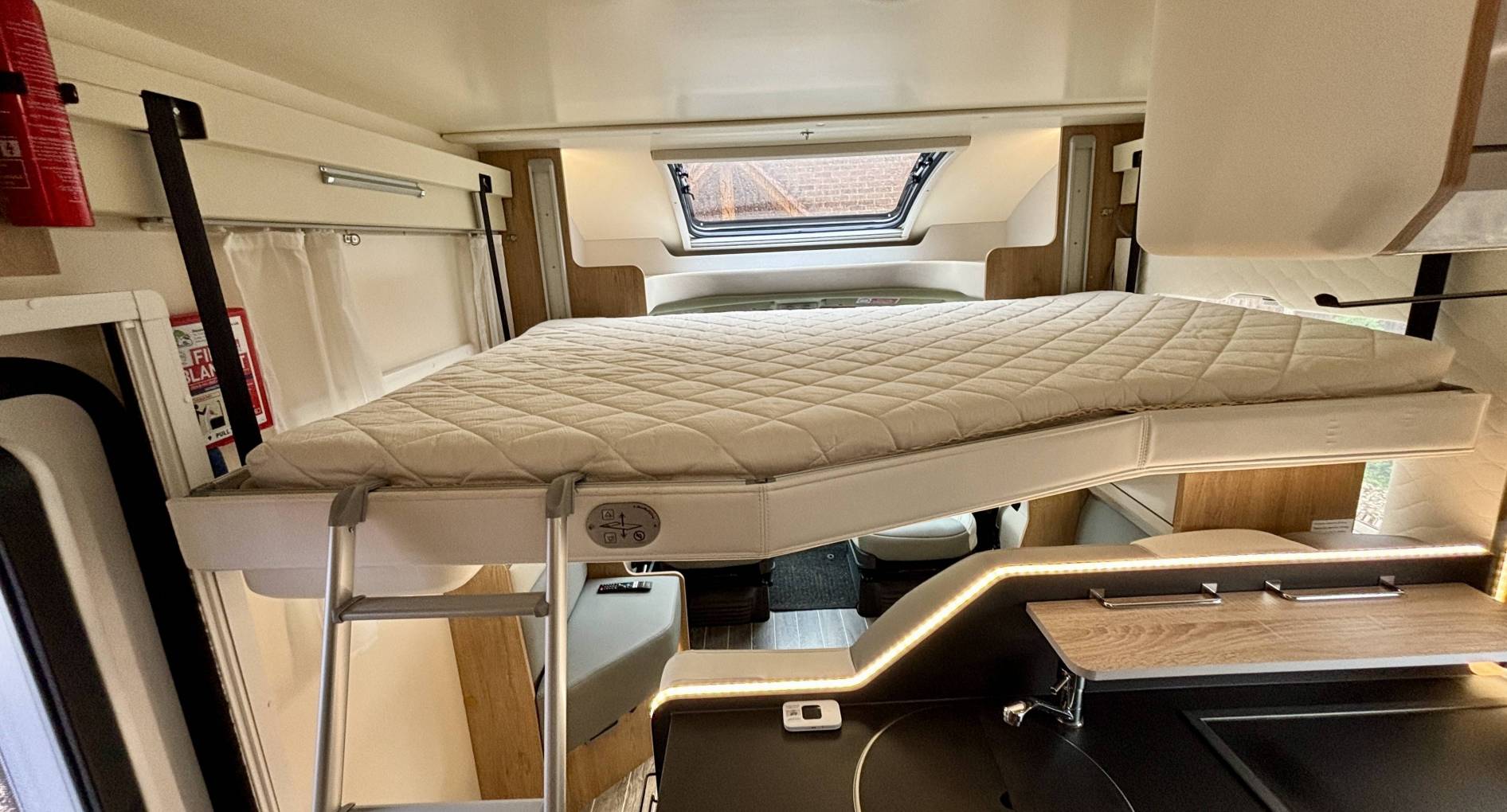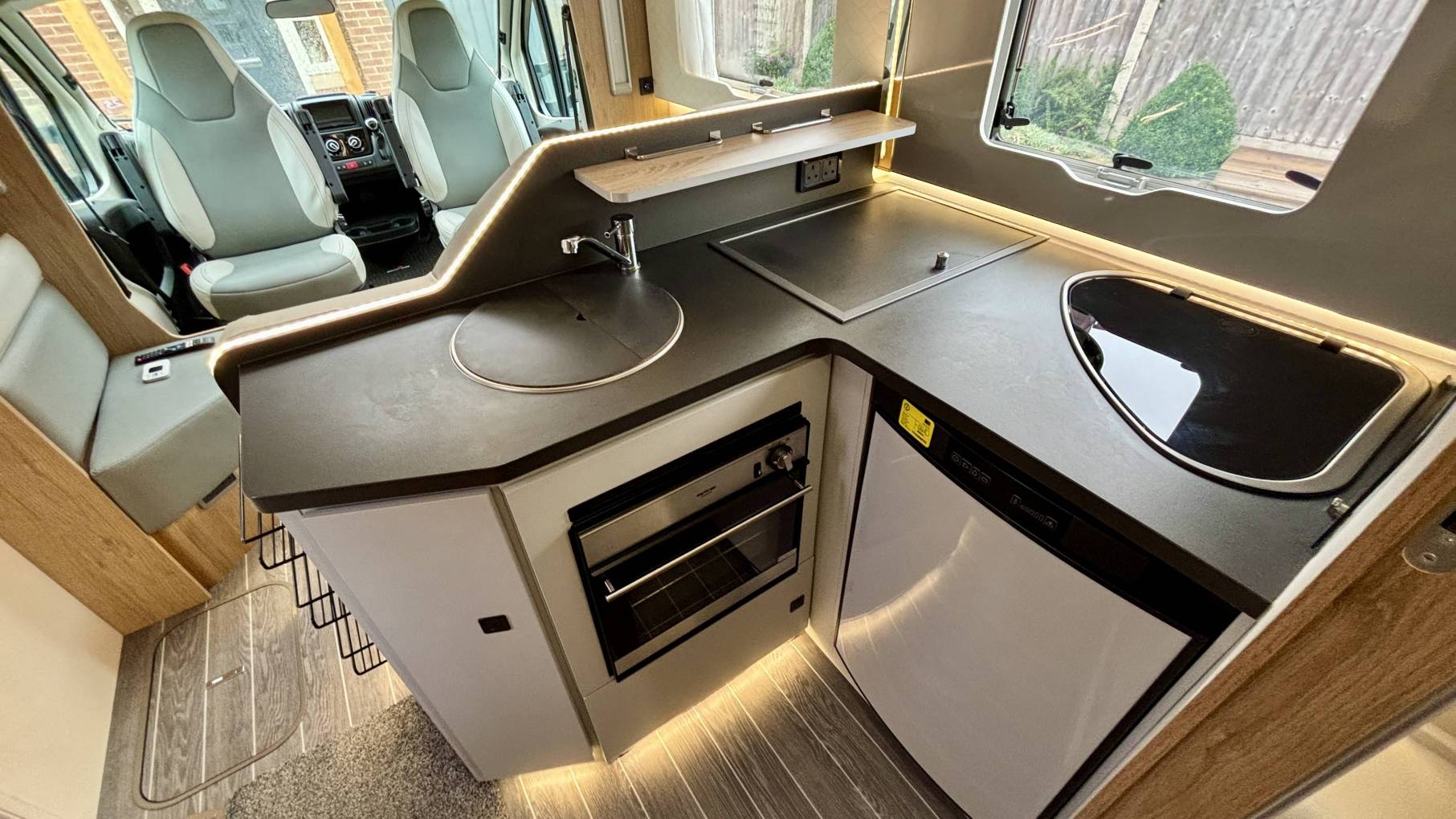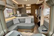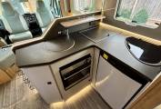 At 7.47 metres in length, the T-Line 743 offers a spacious and luxurious layout, ideal for longer touring. At the rear is a transverse island bed, providing generous sleeping and underbed storage space. There’s a drop-down electric double bed above the front lounge for guests or family, and both front seats swivel to create a large, social living space. The central kitchen is fully equipped with a 3-ring gas hob, oven/grill, fridge with freezer box, and a separate freezer unit cleverly built into the worktop. Opposite, you’ll find a split washroom layout with a separate shower cubicle, offering a more domestic-style bathroom setup.
