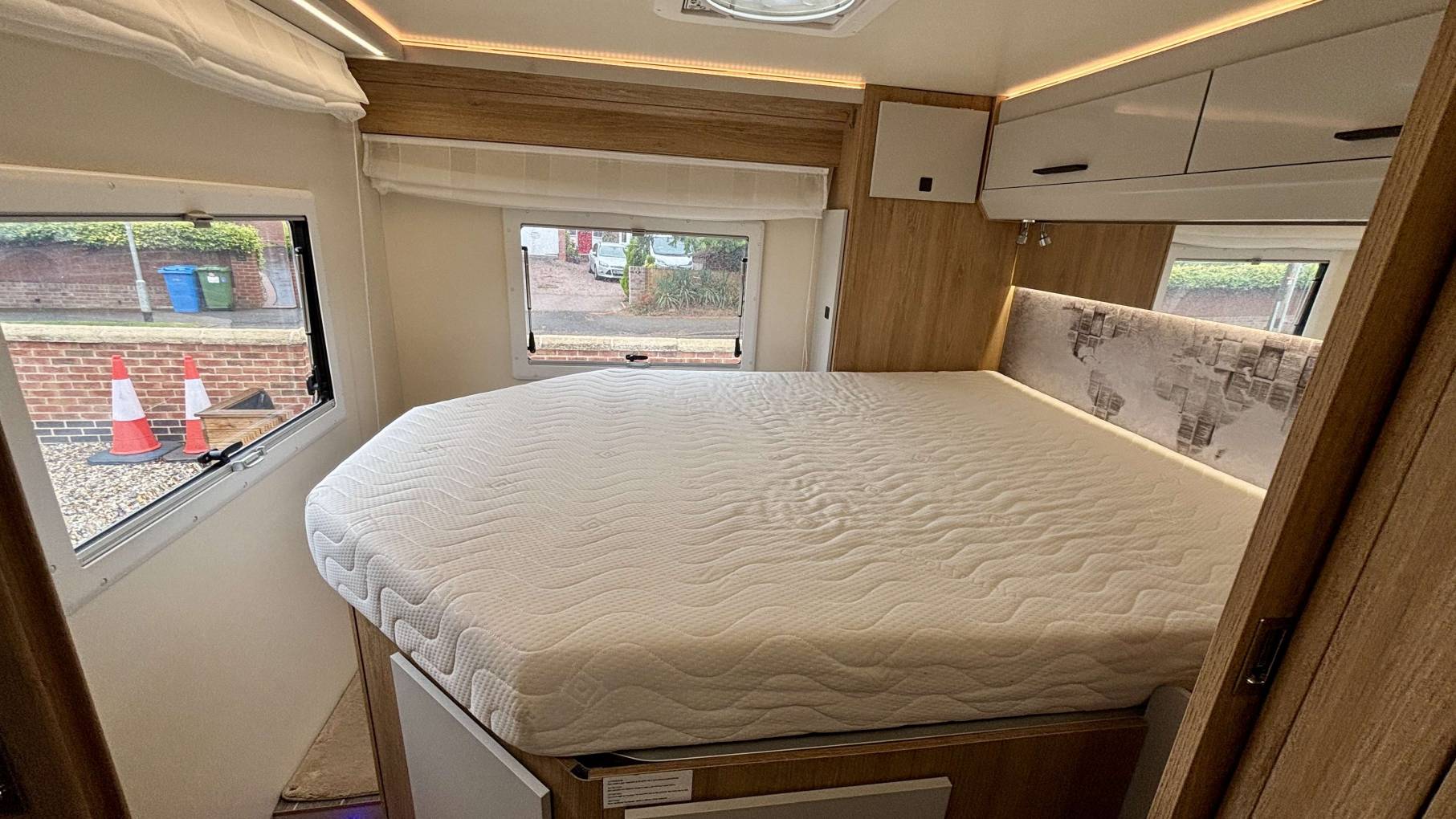 Externally, the van benefits from a huge rear garage, 4-bike rack, external BBQ and shower points, 240v external socket, and mirror guards. Other features include a reversing camera, pop-up TV in the lounge, Maxxair fan in the bedroom, Phantom CAT1 alarm and tracker, and a full set of hook-up cables included in the sale.