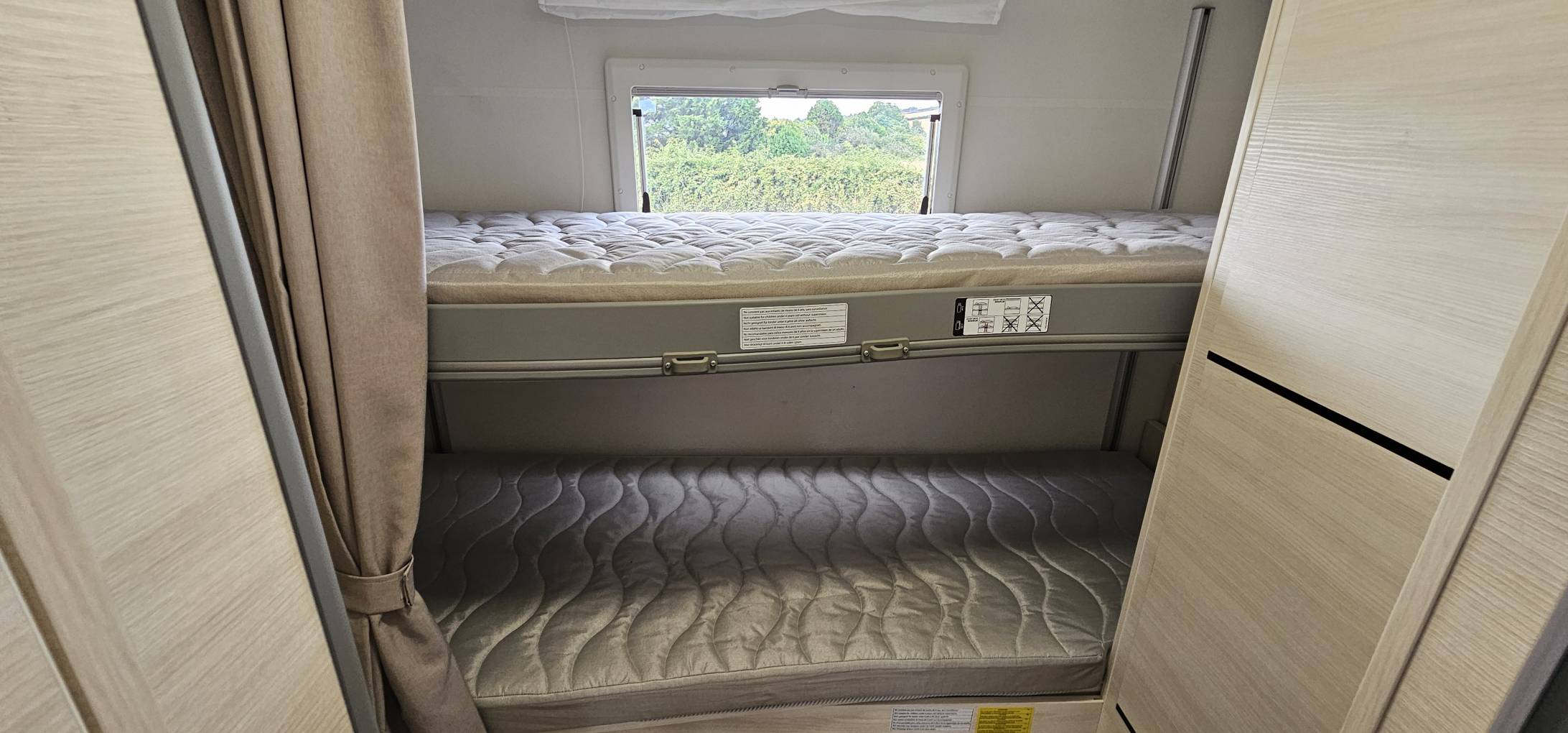 The adjustable transverse electric bunks are located to the rear of the motorhome and sit above the garage space, with a spacious wardrobe situated to the side.