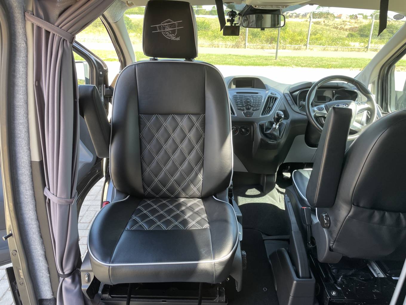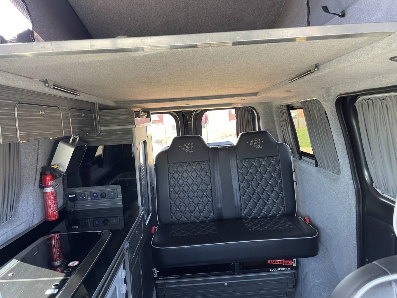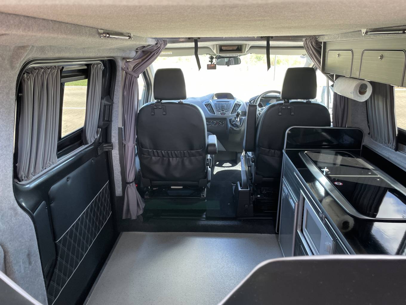 Here we have a ‘Tiger Moth’ - number TM19 - Ford Transit Campervan conversion. The exterior looks beautiful in black with silver running boards and has an awning rail if you want to extend your living space.
