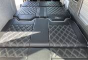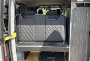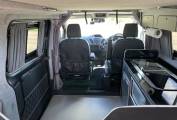 The interior conversion by Tiger Moth looks fantastic with the black leather interior trim, modern looking grey cupboards with black gloss work top, compressor fridge/freezer, 2 ring hob, sink and tap as well as a heater when on electric hook up. Although this is a SWB van it has 4 berth and 4 seat belts with plenty of room and space to store everything and still room to make your cup of tea in the morning when the rock and roll bed is still out.
