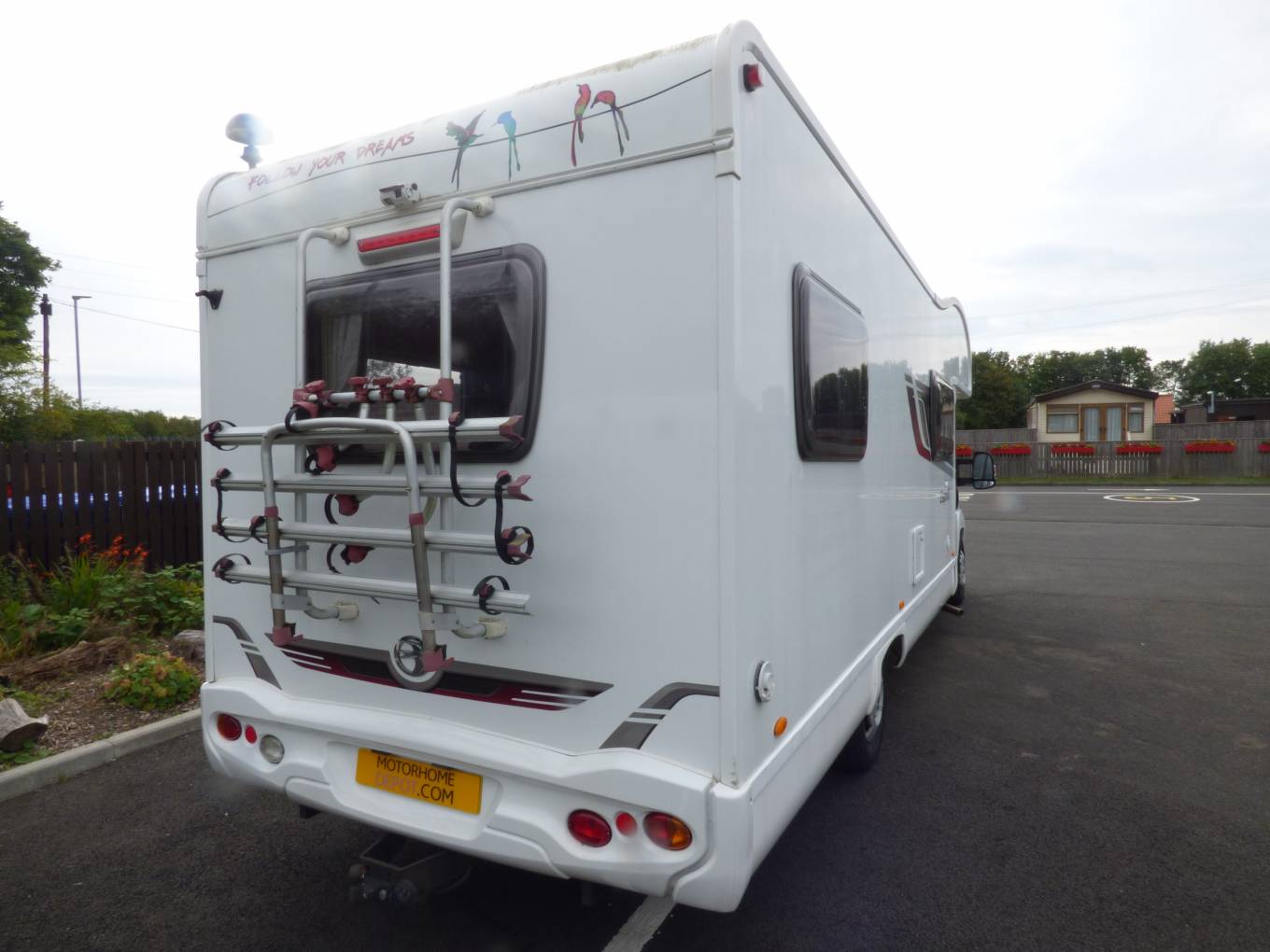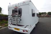 Externally the motorhome enjoys a large wind out awning, a 130 watt solar panel, 2 x leisure batteries with dual charger, reversing camera, 4 x bike rack and satellite navigation.