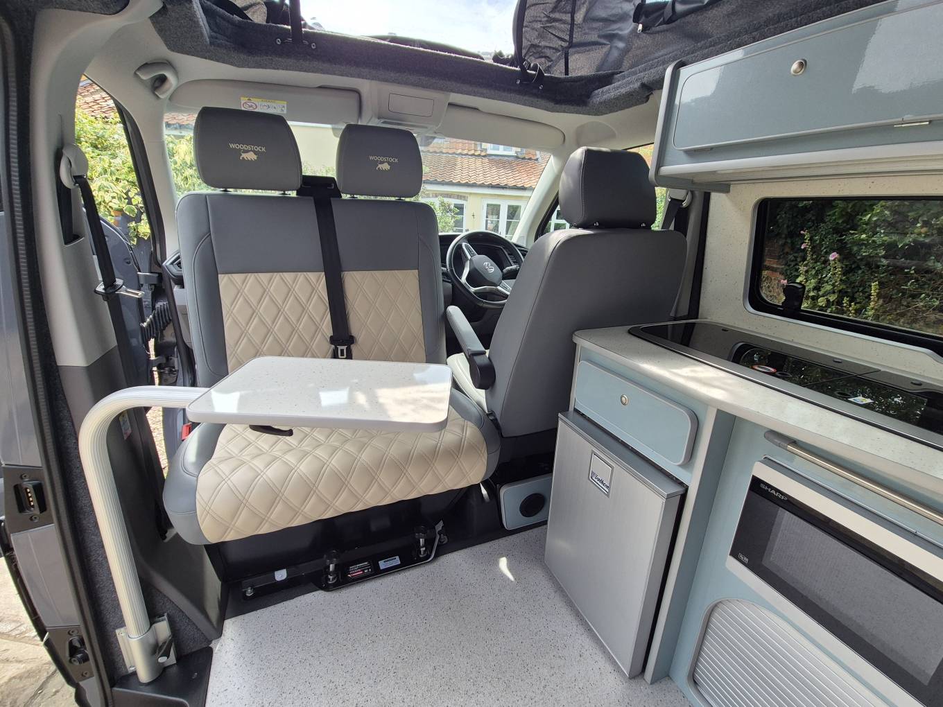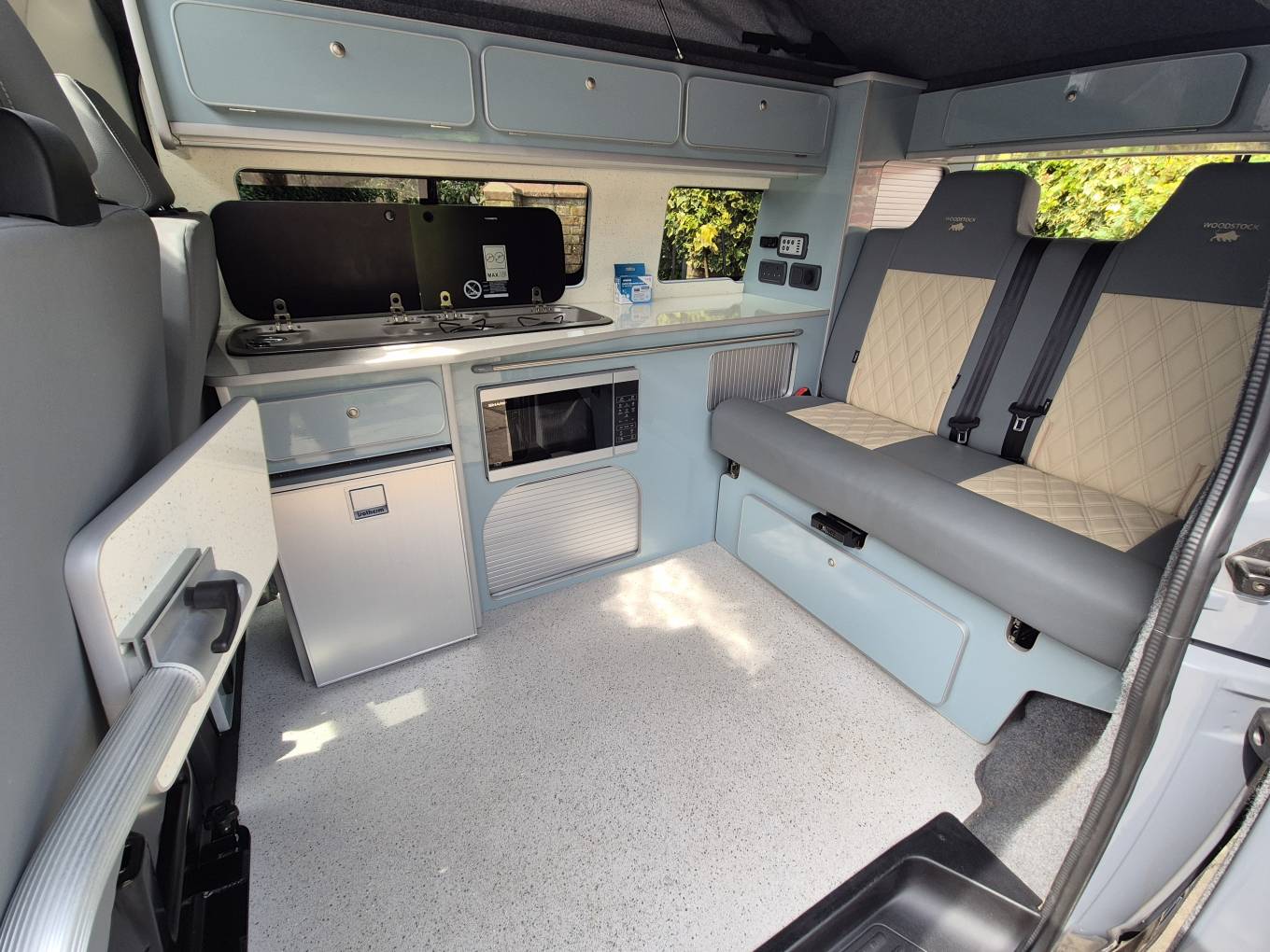 Motorhome Depot is delighted to present this Stunning 2022 4 Berth VW T6 2.0L T28 Startline Woodstock Campervan conversion with 5 seatbelts and 16312 miles on the clock. Woodstock’s attention to detail gives this camper a luxurious and modern feel that is perfect for all types of traveller. The seats are finished in a sumptuous stitched grey and cream leather and the interior is a pale blue with contrasting worktop .Utilities include a Dometic double-ring gas hob and chrome sink combination, on board cold water, microwave, fridge with freezer compartment, and plenty of storage cupboards. The habitation space has plenty of room for a family to enjoy the living/dining area and has ambient lighting at the touch of a button. The double passenger seat swivels into the living space for two people to sit comfortably opposite the rear Rock ‘N’ Roll seats. The foldaway dining table & small side table make this a comfortable and relaxing area to socialise and dine. At night, the Rock ‘N’ Roll seat very easily converts into a large and very comfortable double bed, whilst the Pop-Top roof allows for plenty of headroom for the daytime and converts to a double sleeping area at night to complete the 4 berths. The cab area comes complete with cab air con, DAB entertainment system. Also included are: Wind out awning ,alloy wheels, solar panel and a removeable tow bar. For use in cooler months, there is a diesel heater to keep you warm, even when off-grid and the solar panel provides battery charging without reliance on the electric hook up.